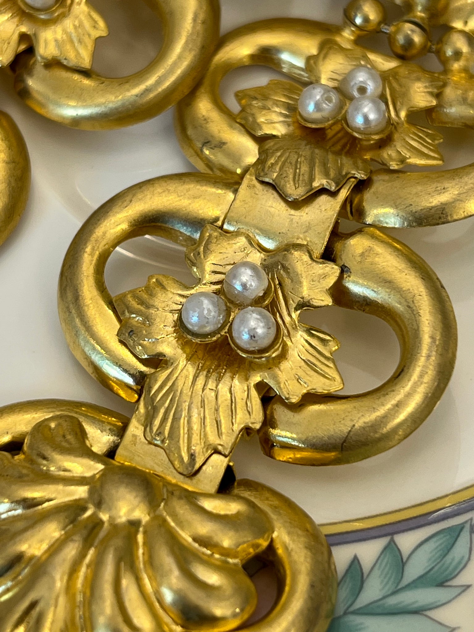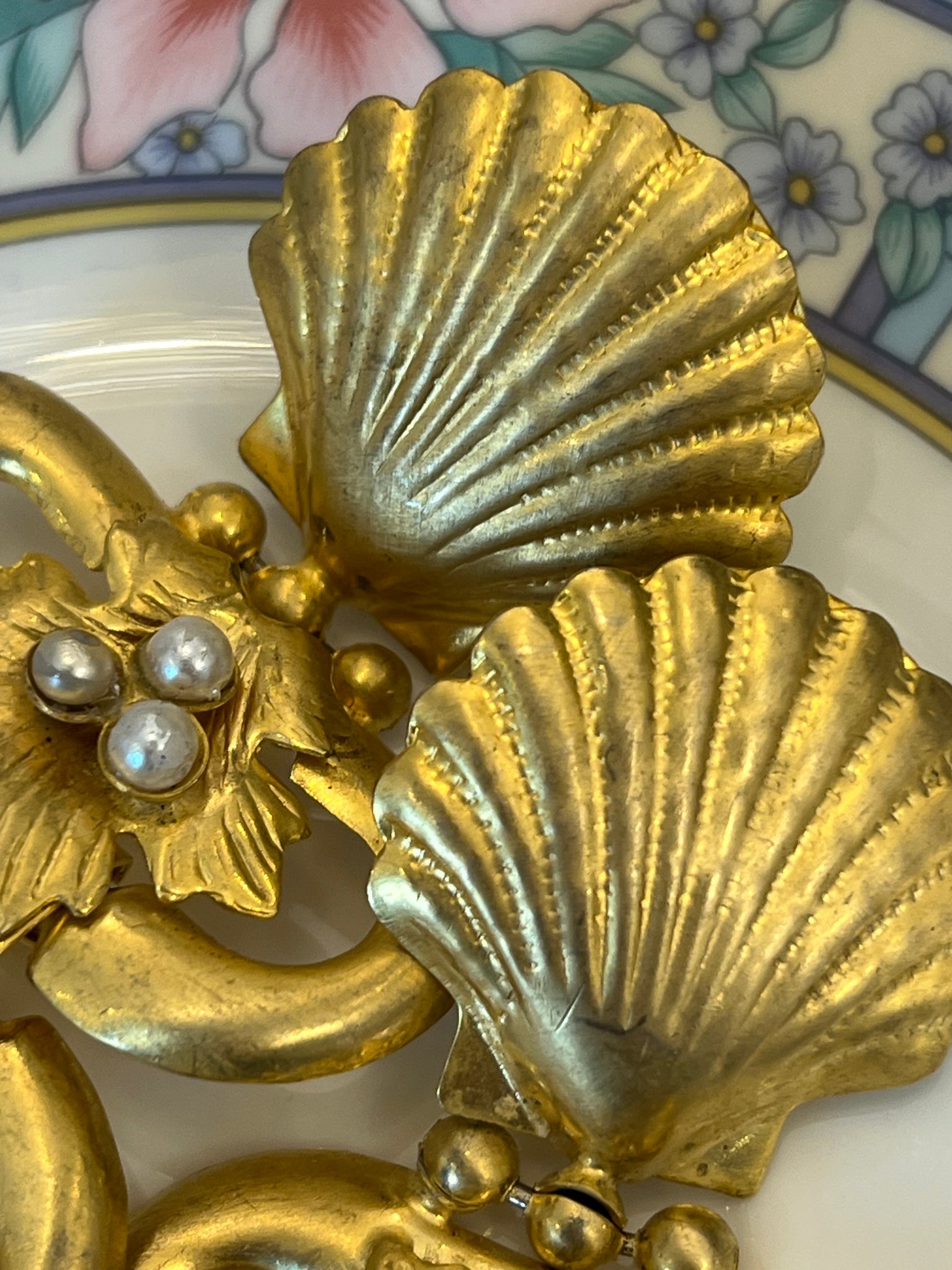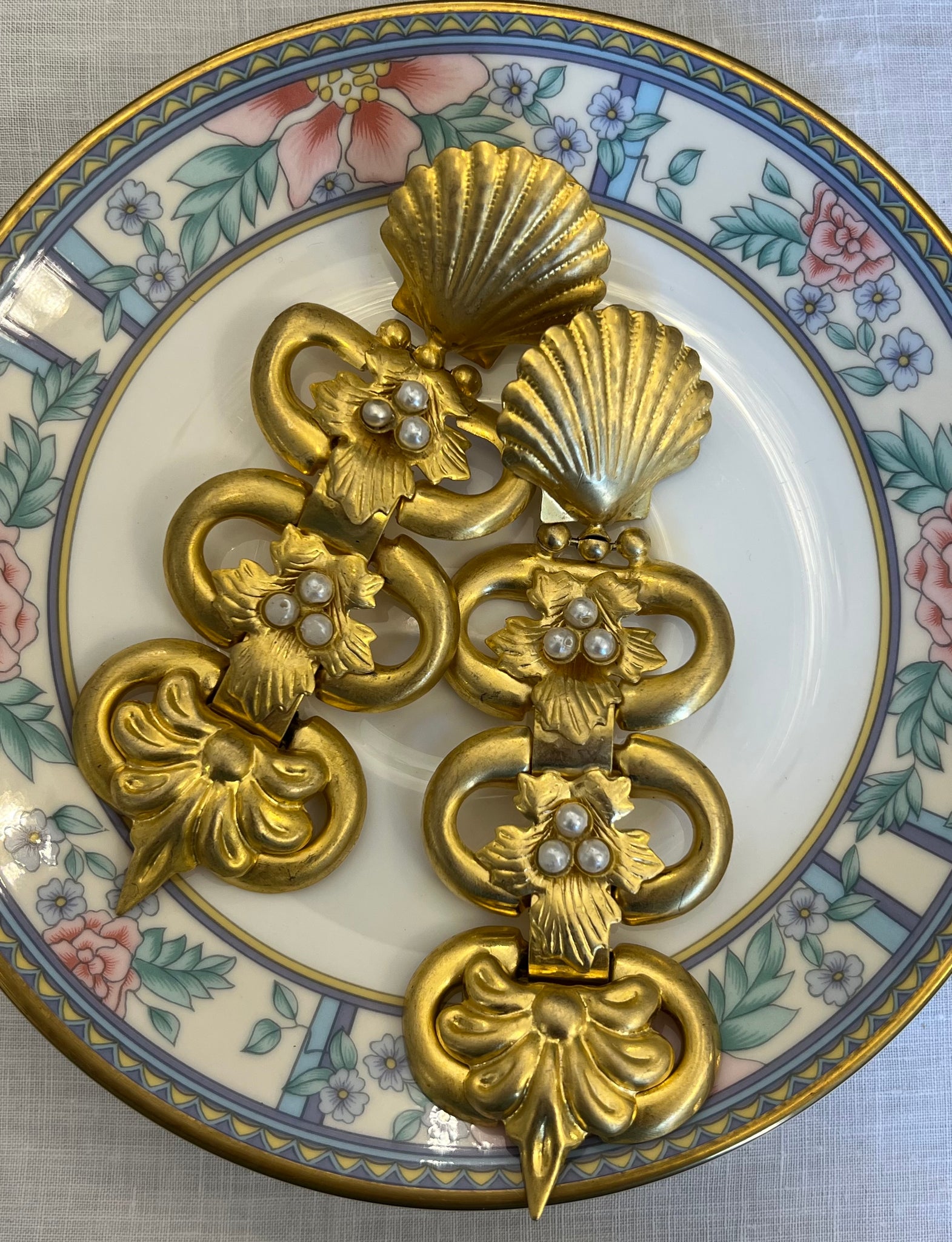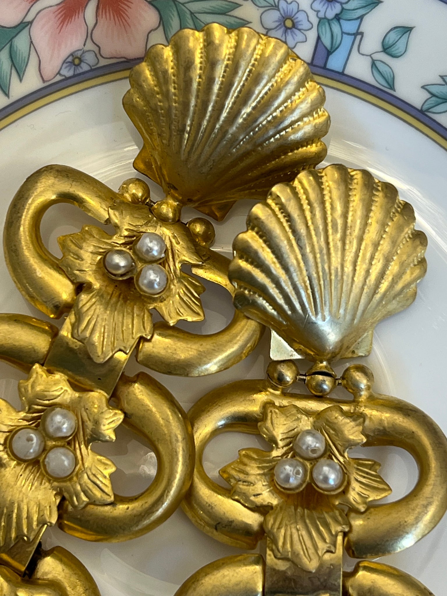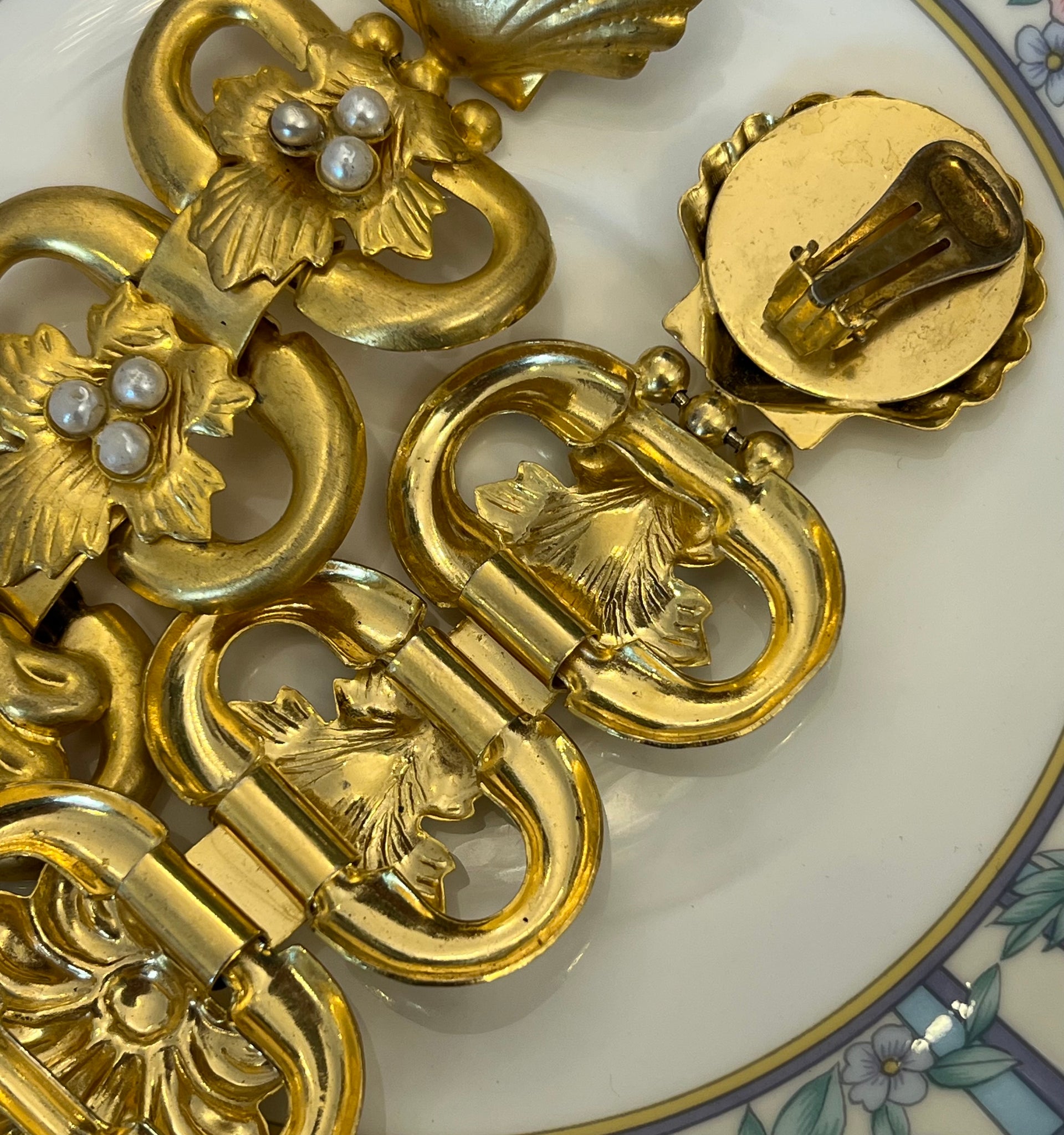 Cercei vintage, realizați dintr-un metal auriu, finisat mat, cca. anii ‘80. Designul începe cu un element în formă de scoică și o cascadă de patru segmente interconectate, împodobite cu perle sintetice rotunde. Acești cercei sunt creați pentru a impresiona, fiind perfecți pentru evenimente speciale sau pentru a adăuga un accent dramatic unei ținute monocrome.