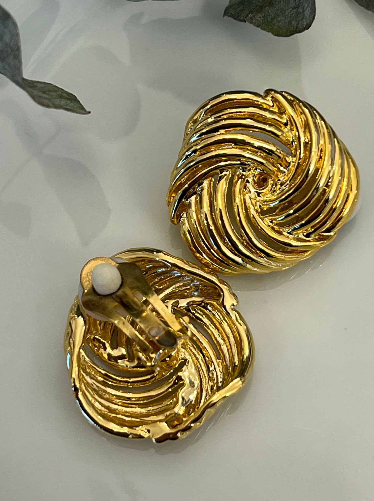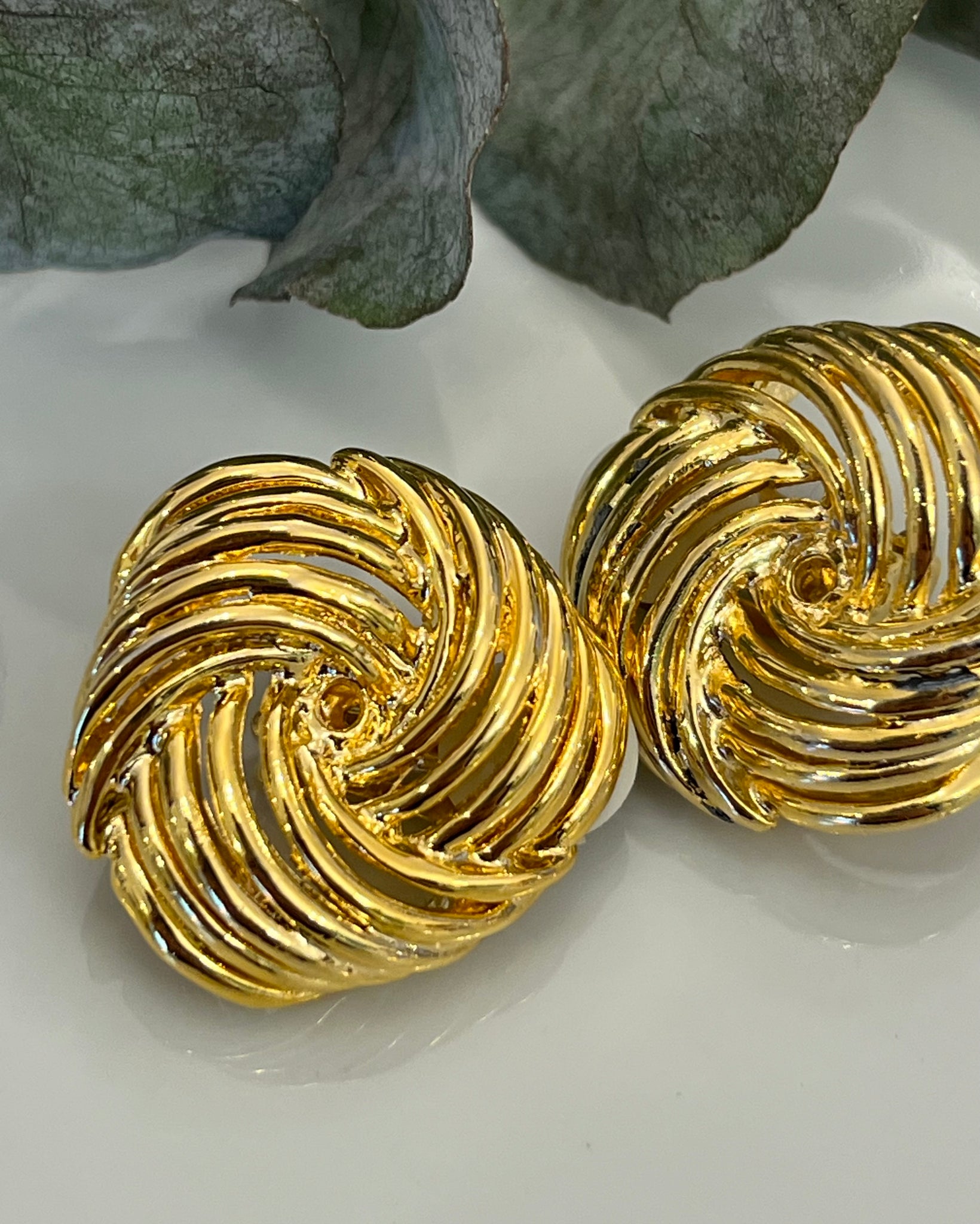 Cercei vintage, cca. anii '90, cu linii fluide, realizați din metal auriu. Sunt de tip clip, potriviți oricui, cu o prindere sigură.