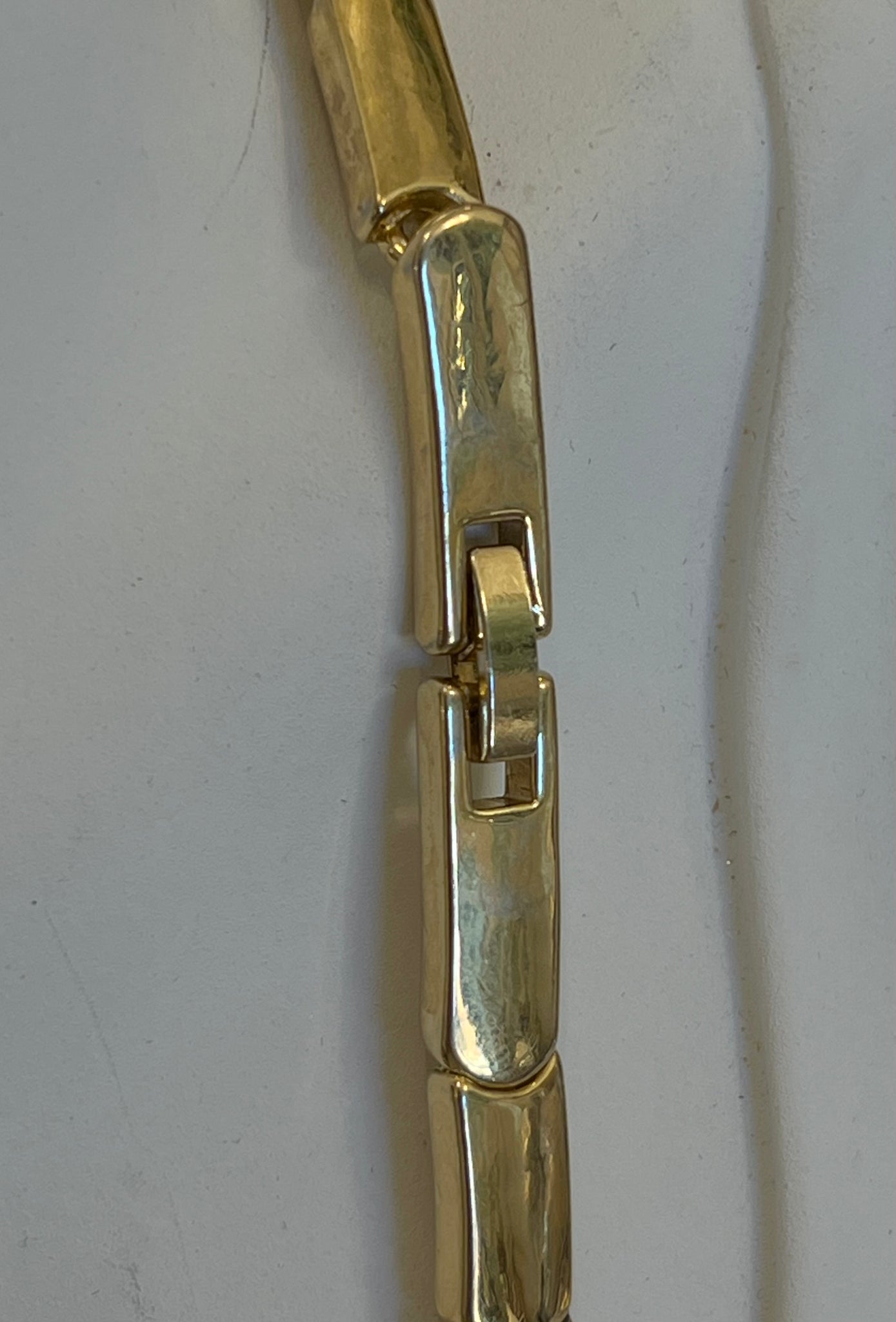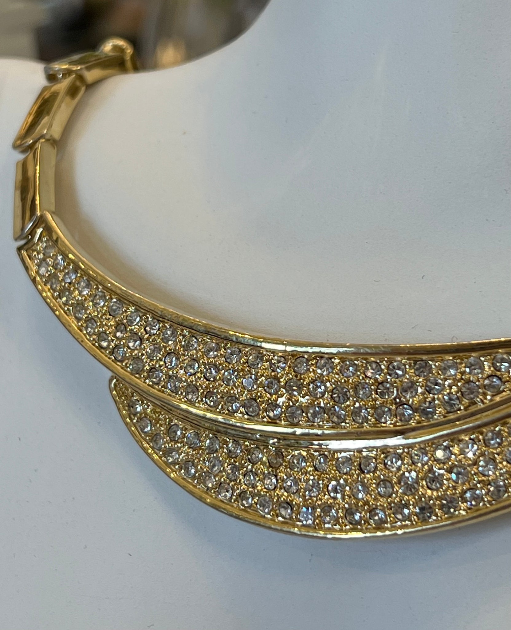 Colier vintage cu o montură masivă, cu două linii curbe care se suprapun, realizat din metal auriu. Aceste linii sunt acoperite în totalitate de cristale mici, strălucitoare, într-un aranjament tip pavé, ce creează un efect spectaculos de sclipire. Proveniență Italia, cca. anii ‘90. Colierul se adaptează perfect pe linia gâtului, fiind o piesă de rezistență, ideală pentru evenimente deosebite.