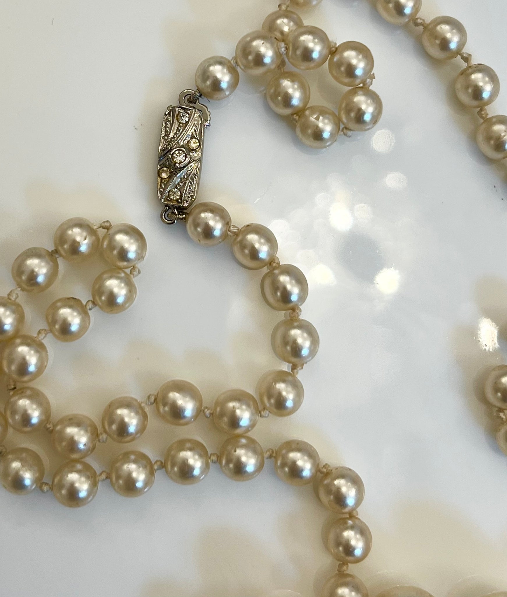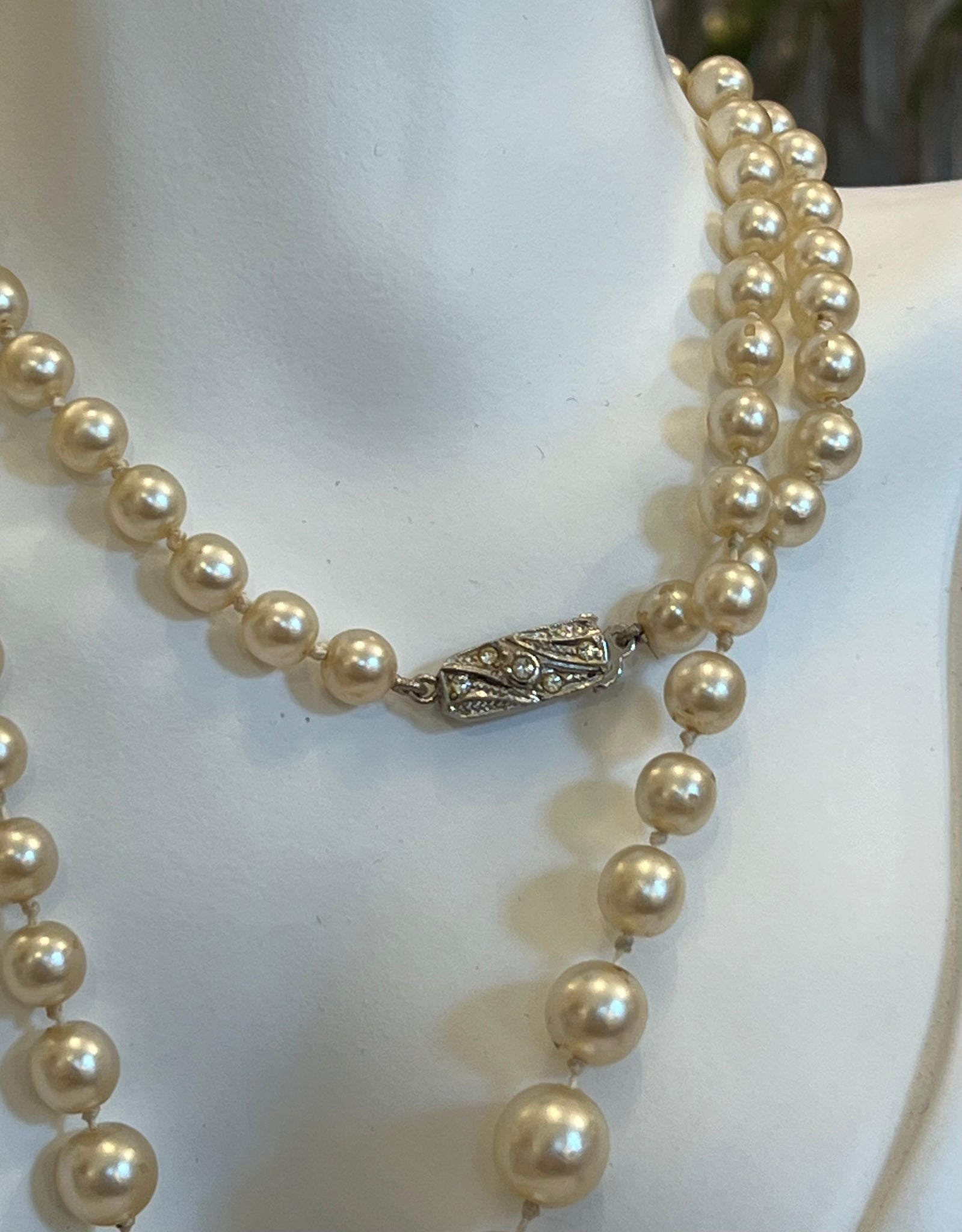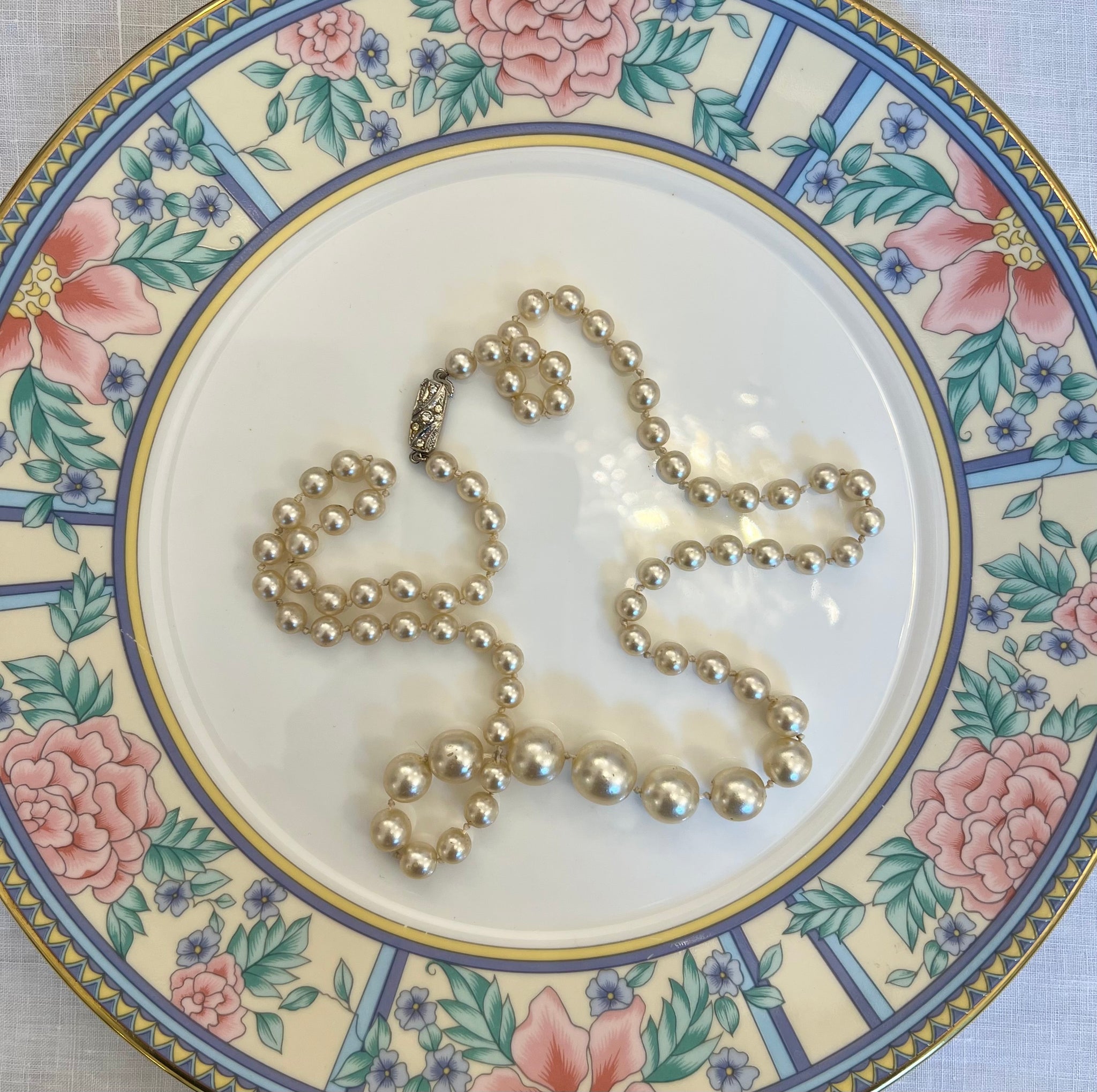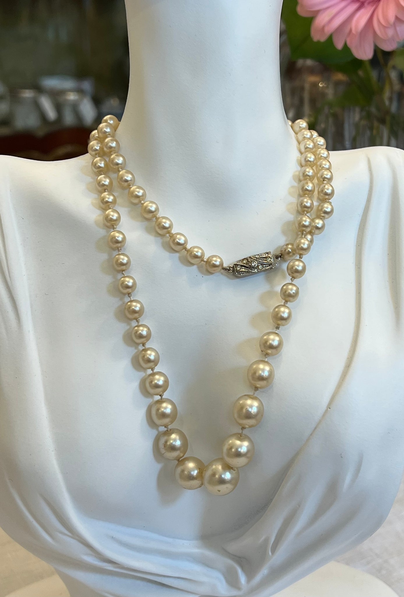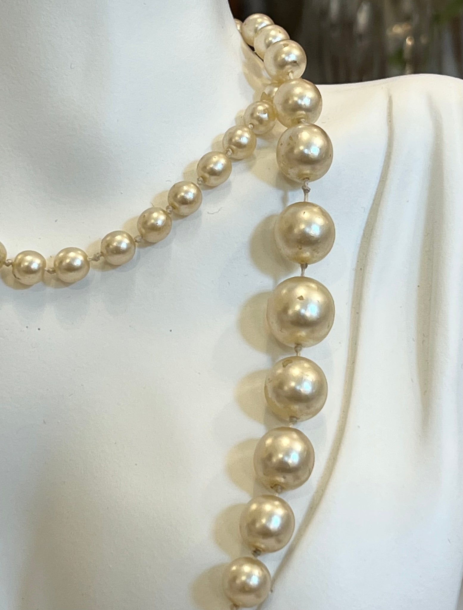 Colier vintage realizat din perle, cca. anii '90, in sti Art Nouveau, proveniență Italia. Perlele din sticlă sunt dispuse într-un șirag simplu, cu noduri între fiecare perlă. Dimensiunea perlelor din mijlocul șiragului este mai mare.