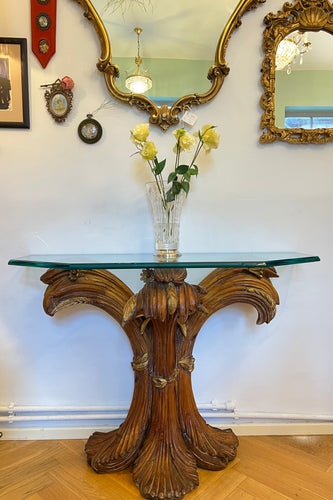 • Consolă vintage din lemn sculptat cu blat din cristal, cca. anii ‘60