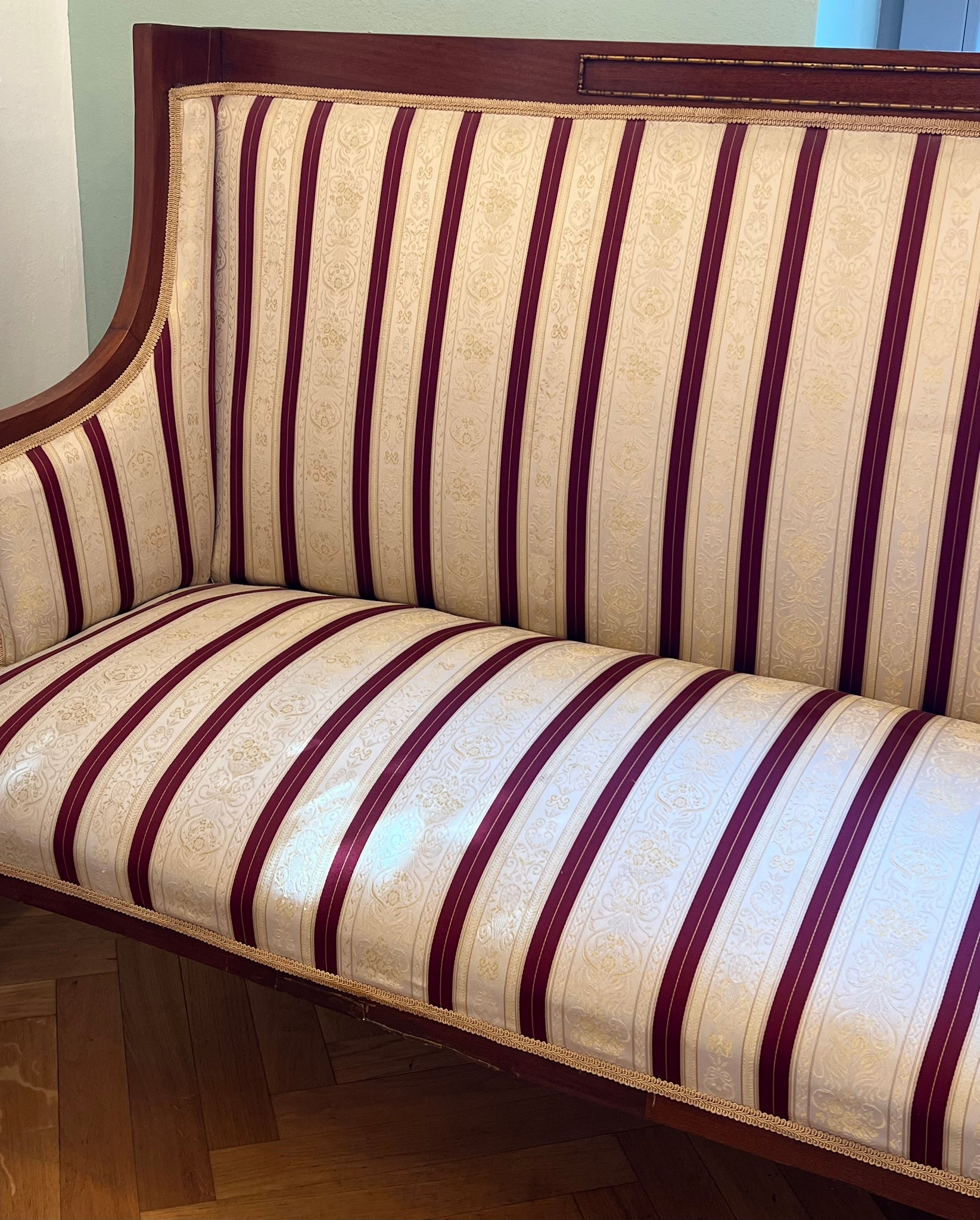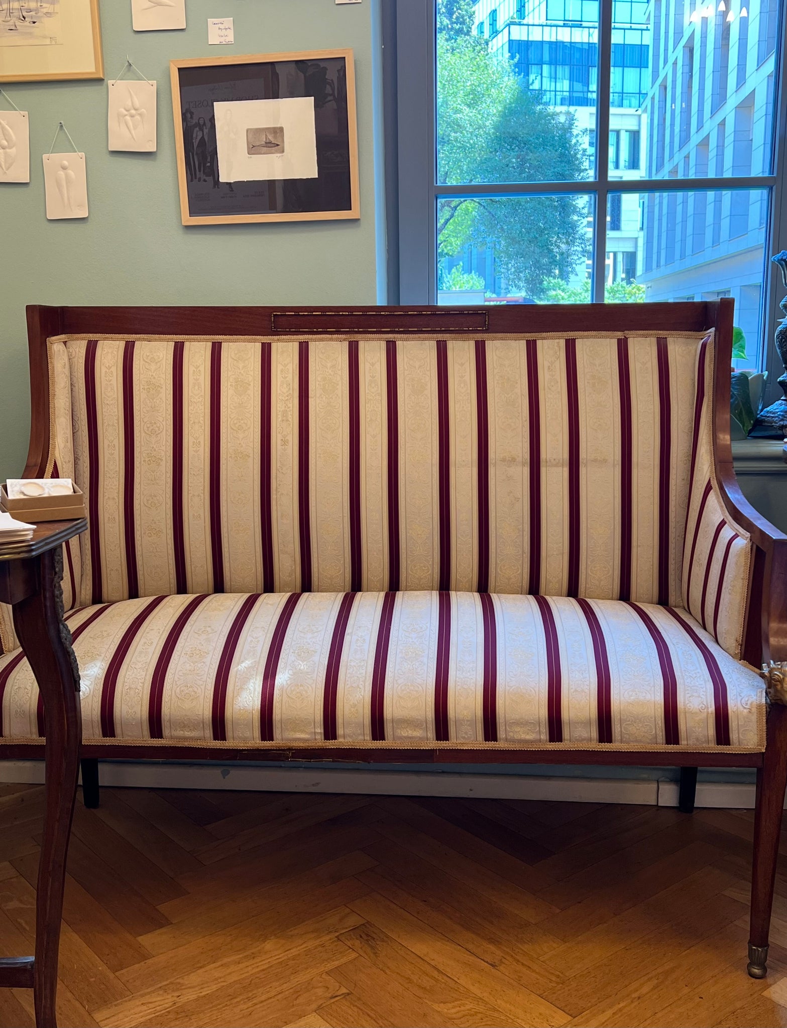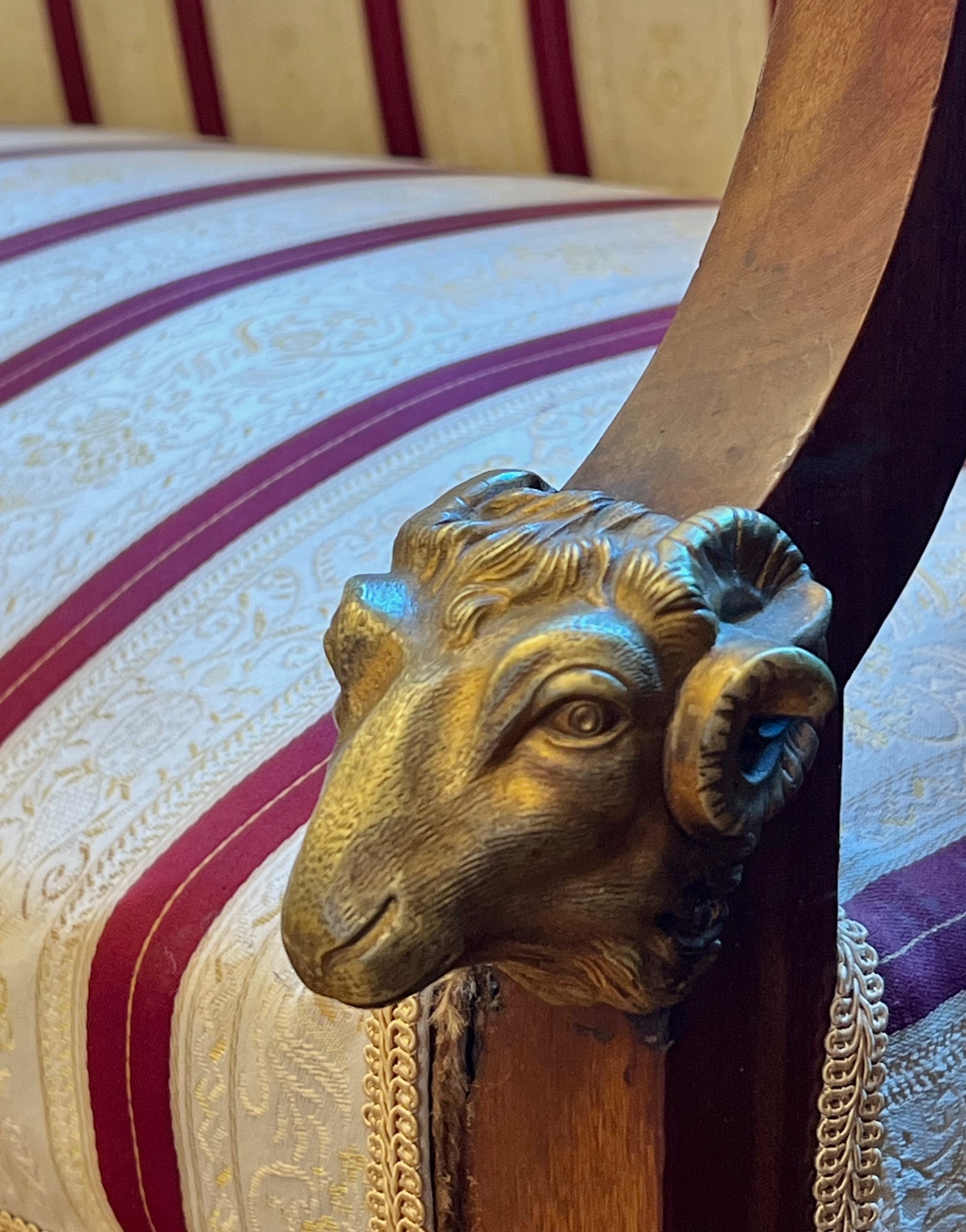 Canapea vintage, ce provine din Franța și a fost realizată în jurul anilor 1950. Structura este din lemn masiv, tapițeria este din stofă de calitate, cu dungi verticale și motive vegetale discrete aurii. Un element distinctiv este ornamentul în formă de cap de zin tu, turnat în bronz aurit, amplasat la capătul fiecărui braț. Acest motiv decorativ simbolizează forța și rezistența. Picioarele sunt drepte, cu terminații metalice protectoare.