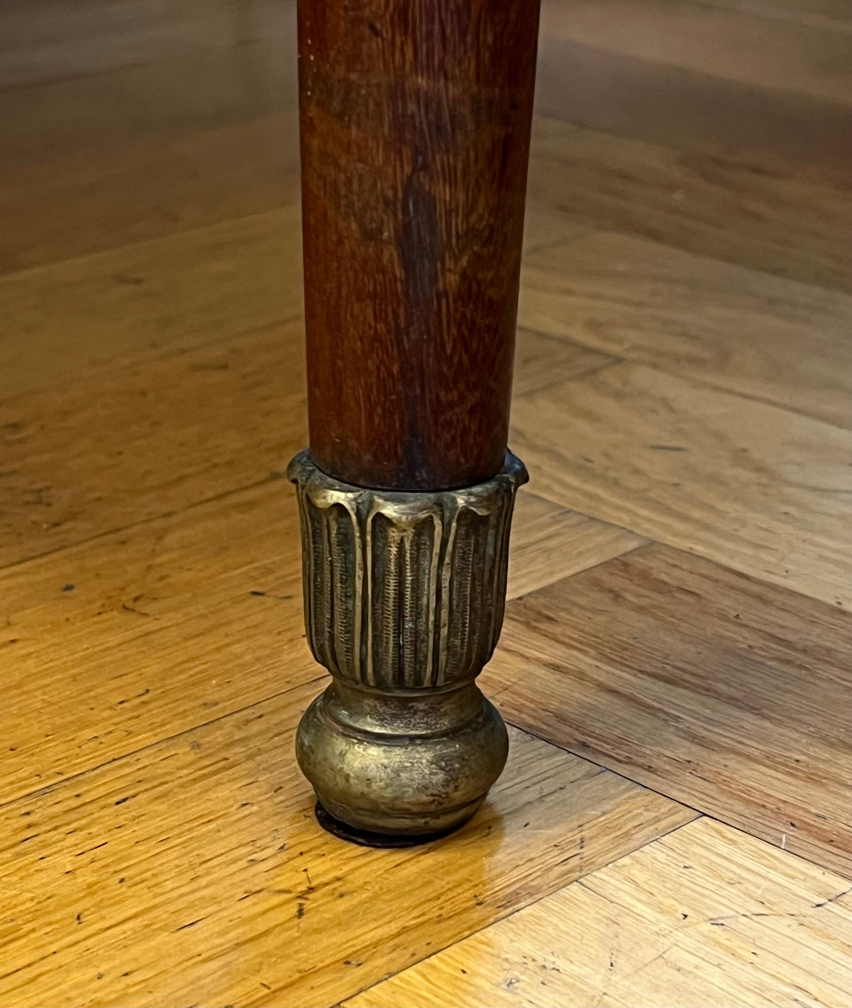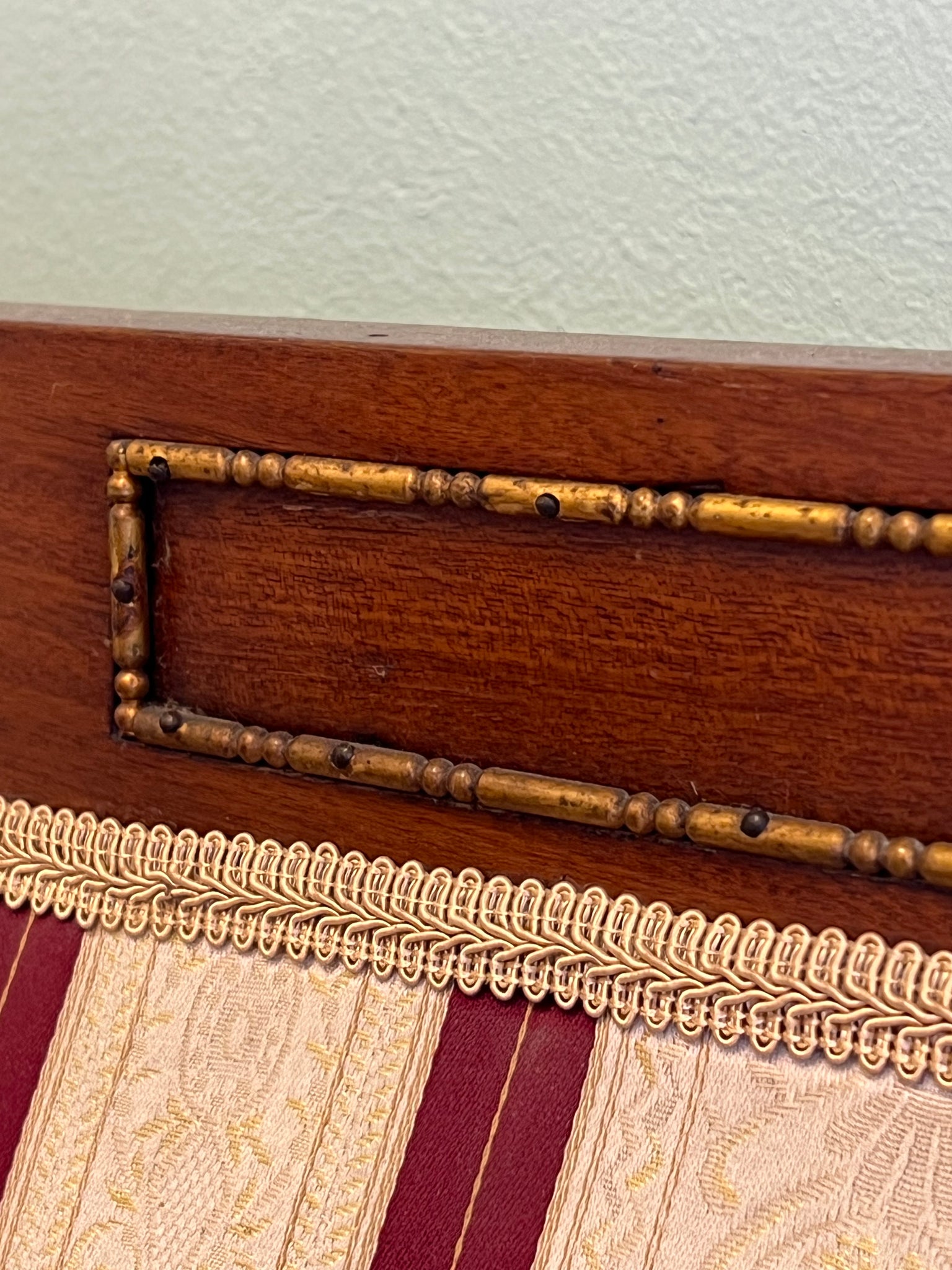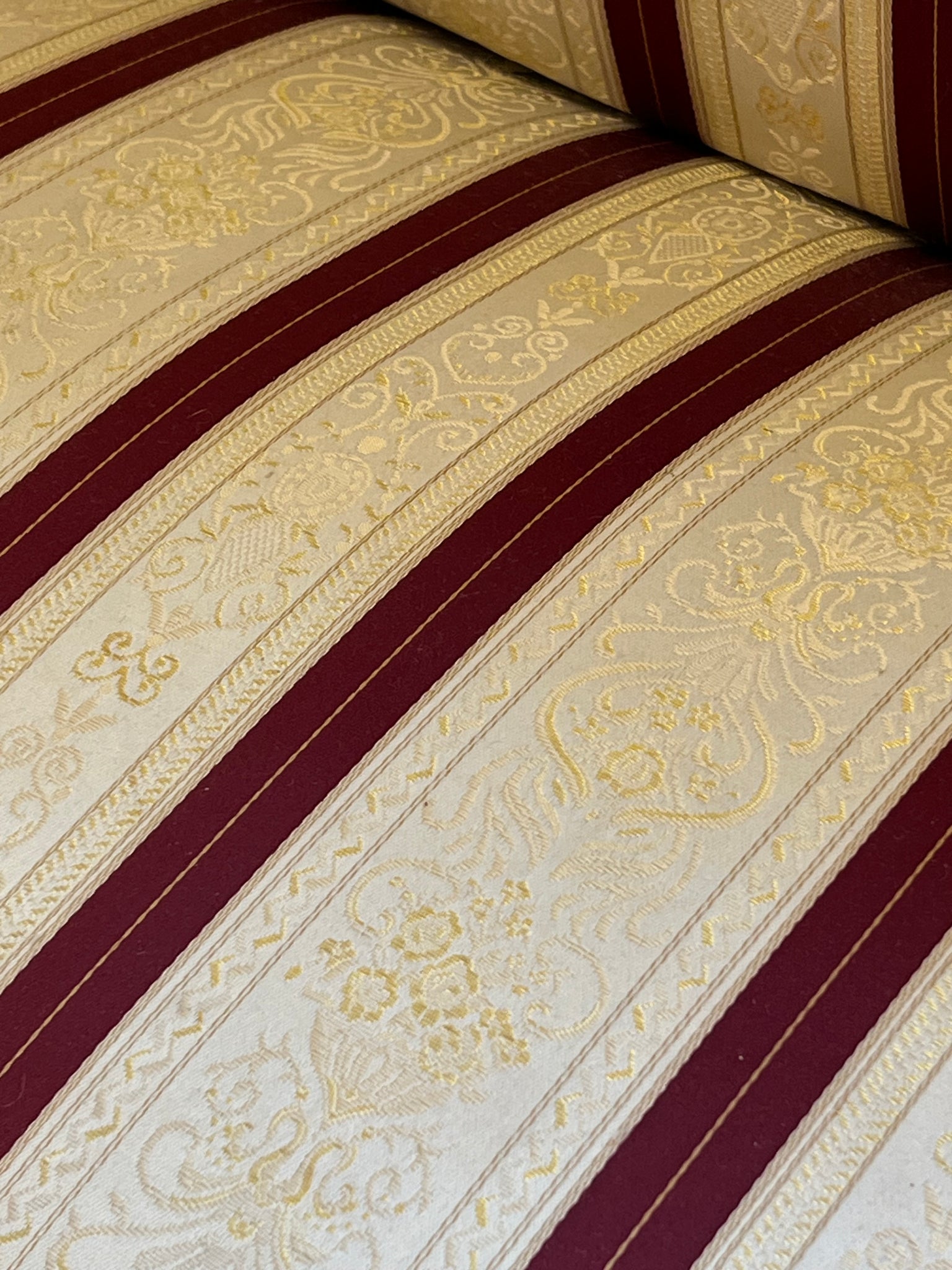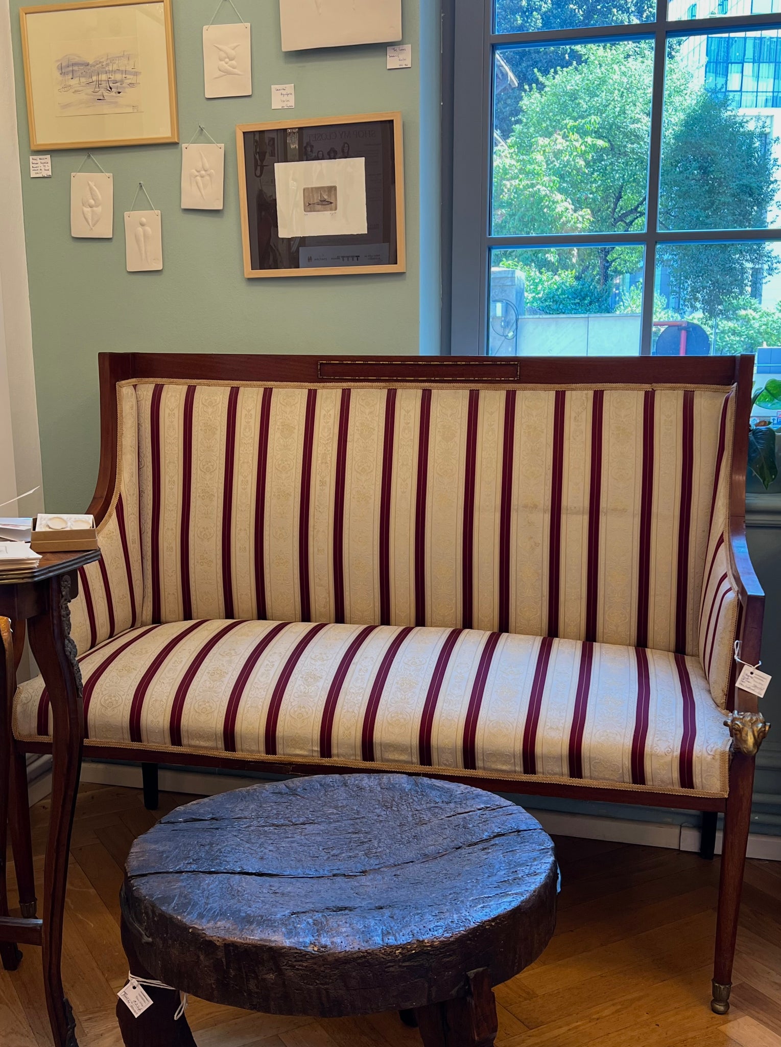Canapea vintage, ce provine din Franța și a fost realizată în jurul anilor 1950. Structura este din lemn masiv, tapițeria este din stofă de calitate, cu dungi verticale și motive vegetale discrete aurii. Un element distinctiv este ornamentul în formă de cap de zin tu, turnat în bronz aurit, amplasat la capătul fiecărui braț. Acest motiv decorativ simbolizează forța și rezistența. Picioarele sunt drepte, cu terminații metalice protectoare.