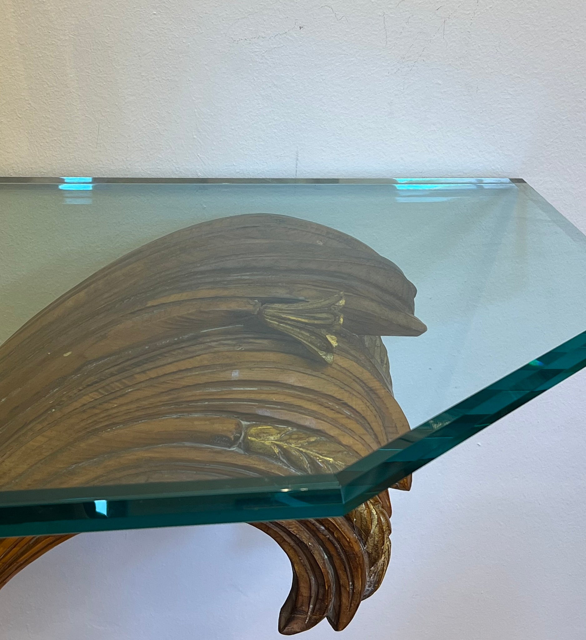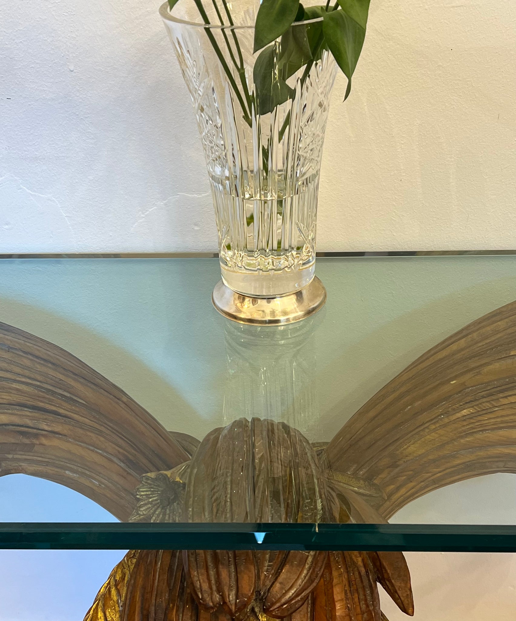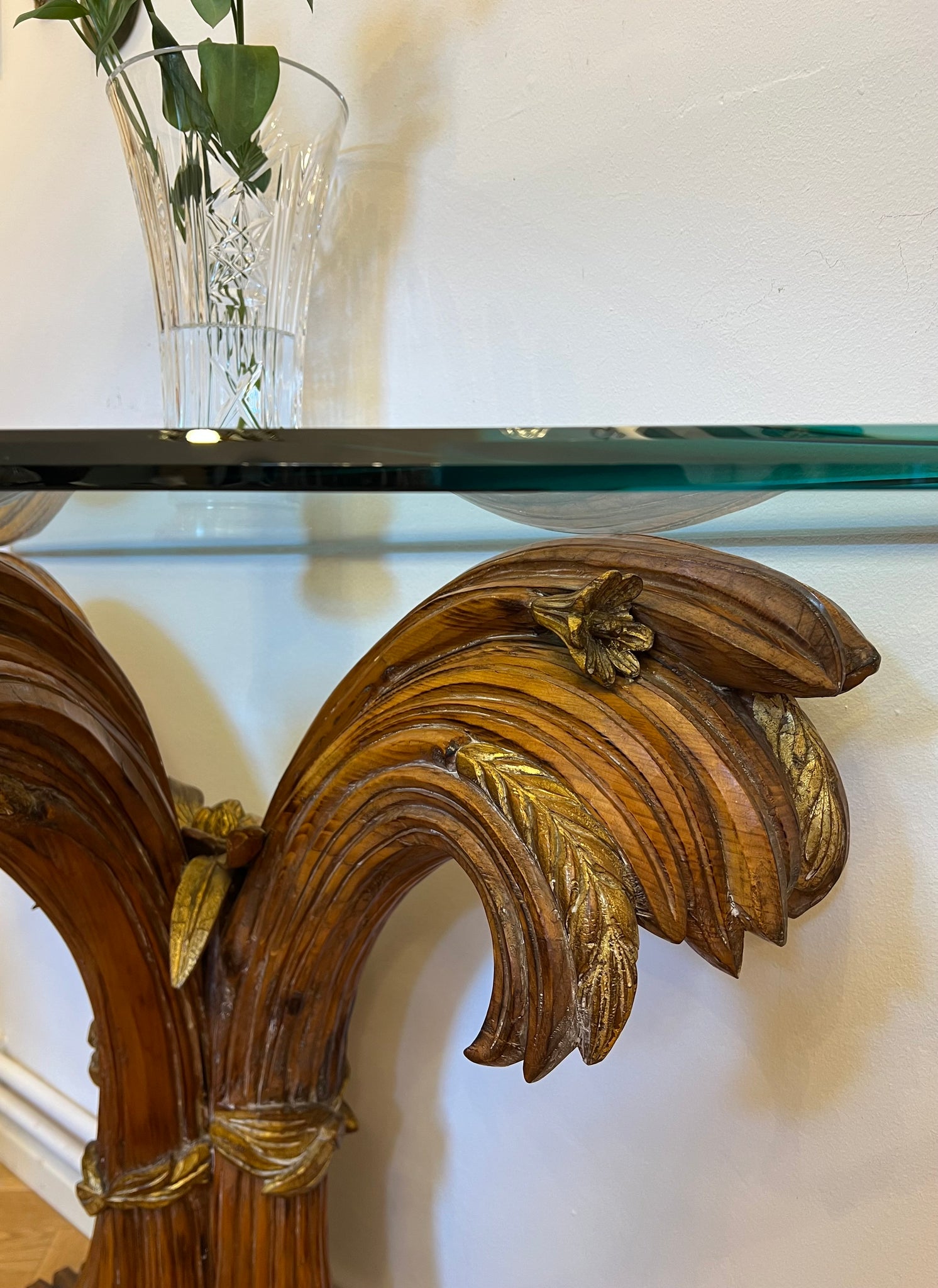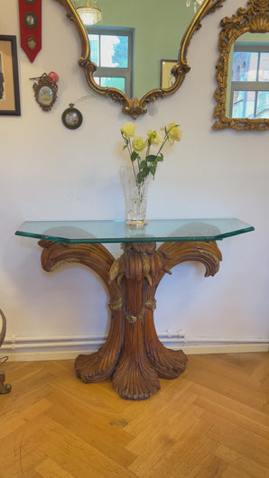 Consolă vintage ce provine din aproximativ perioada anilor 1960, Italia. Baza este realizată din lemn masiv sculptat manual, inspirat de forme vegetale, iar blatul este din cristal gros, ce face ca piesa să reflecte lumina în mod spectaculos. Este o piesă cu personalitate, ideală pentru un hol, living sau orice alt spațiu, de obicei completată cu o oglindă deasupra.