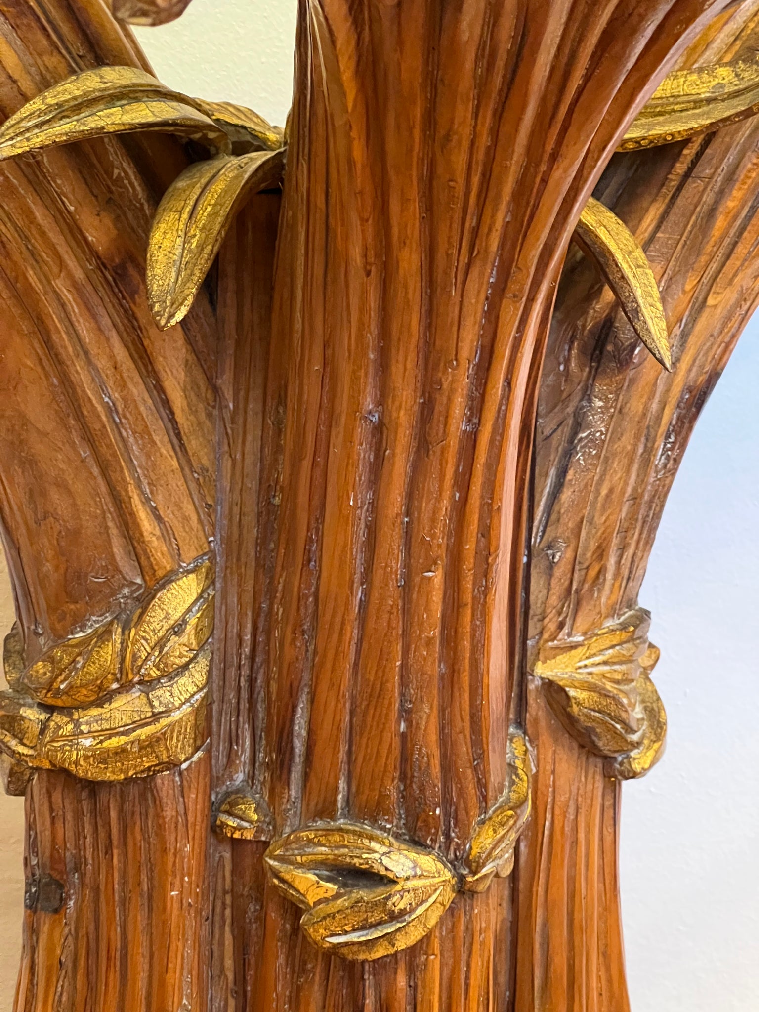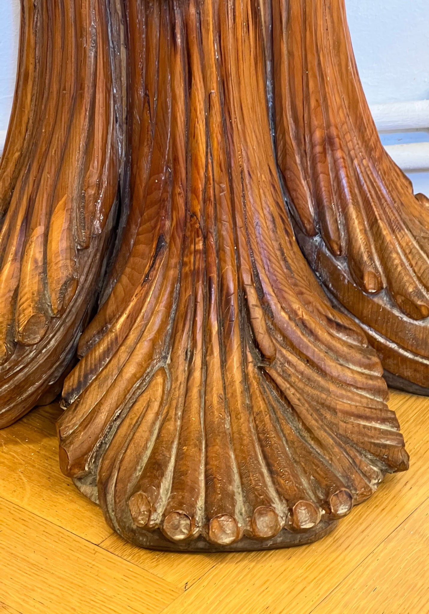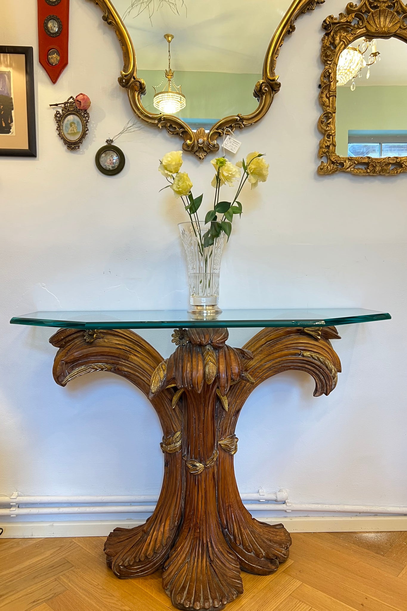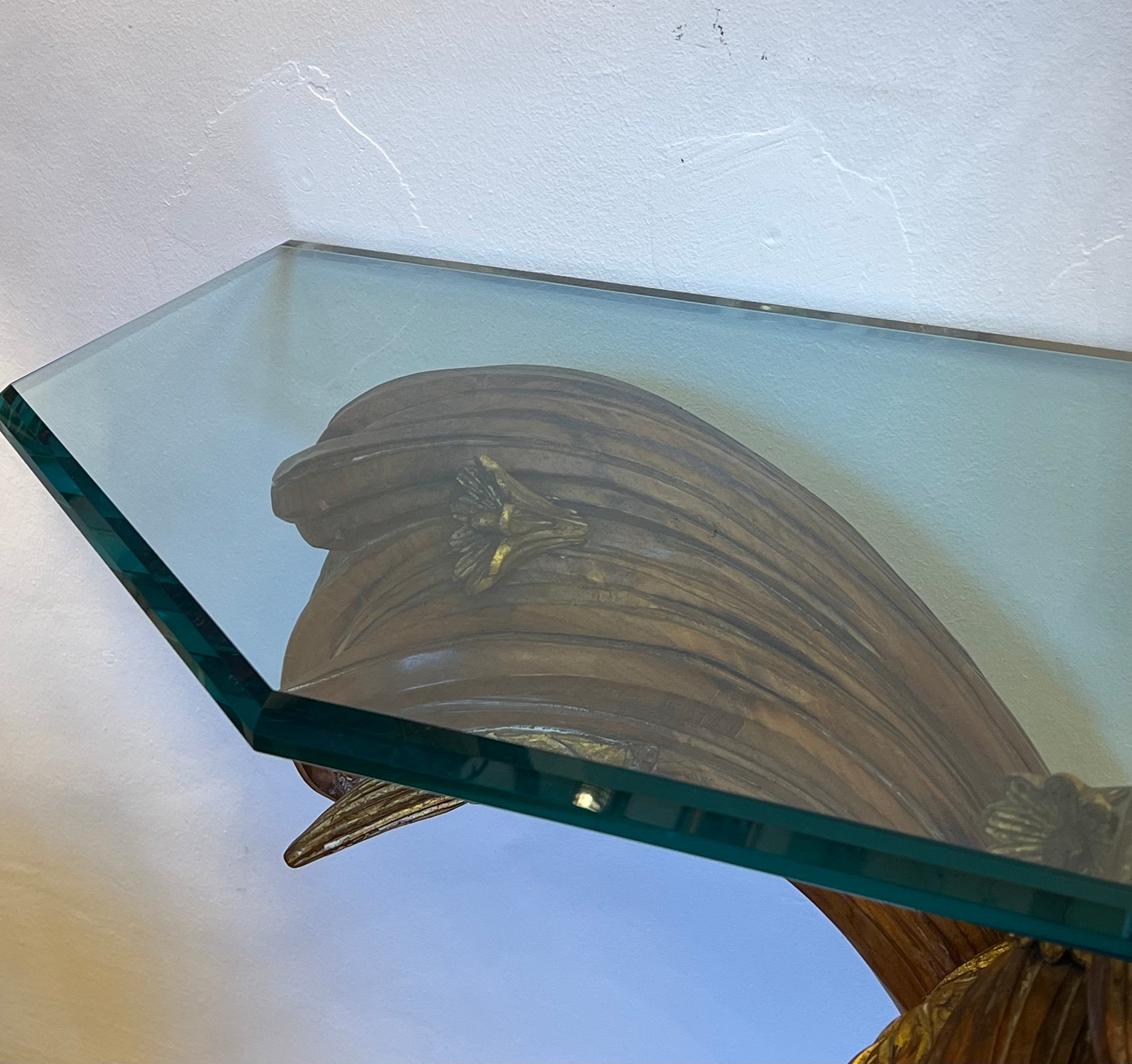 Consolă vintage ce provine din aproximativ perioada anilor 1960, Italia. Baza este realizată din lemn masiv sculptat manual, inspirat de forme vegetale, iar blatul este din cristal gros, ce face ca piesa să reflecte lumina în mod spectaculos. Este o piesă cu personalitate, ideală pentru un hol, living sau orice alt spațiu, de obicei completată cu o oglindă deasupra.