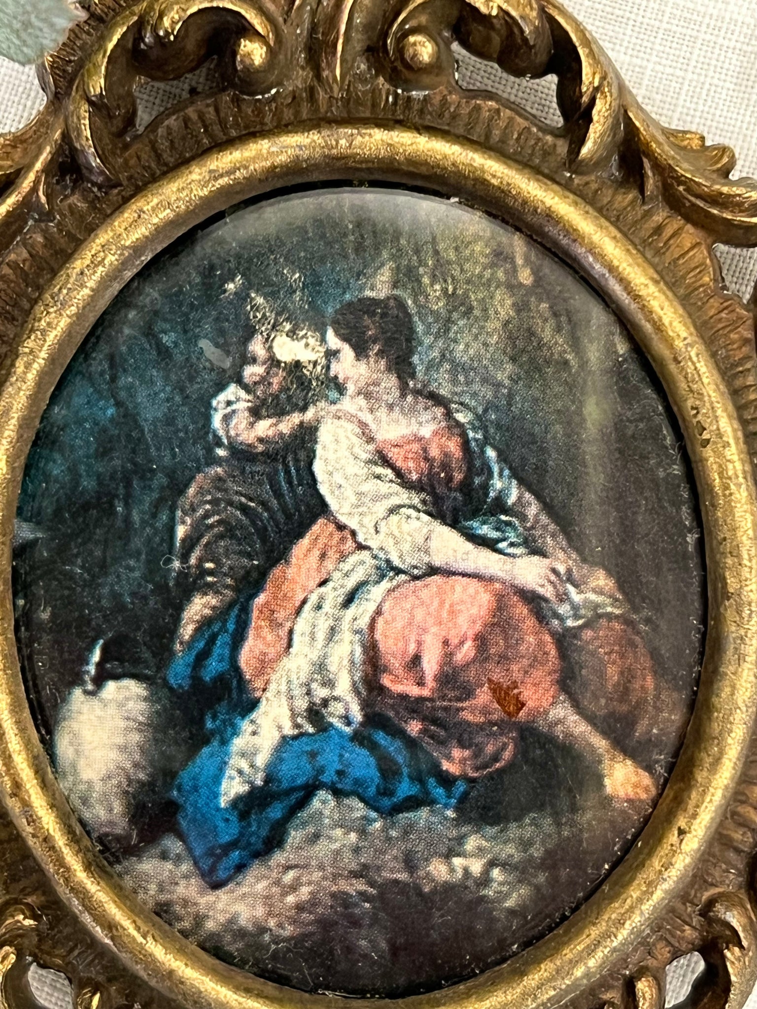 Mini tablou vintage, realizat în Italia, aproximativ anii 1970. Rama este realizată din bronz în stilul Rococo. În centru se află o reproducere a unei scene romantice. Fiind o miniatură, este ideală ca obiect de colecție, medalion de perete sau ca decorațiune pe o etajeră sau într-o vitrină.