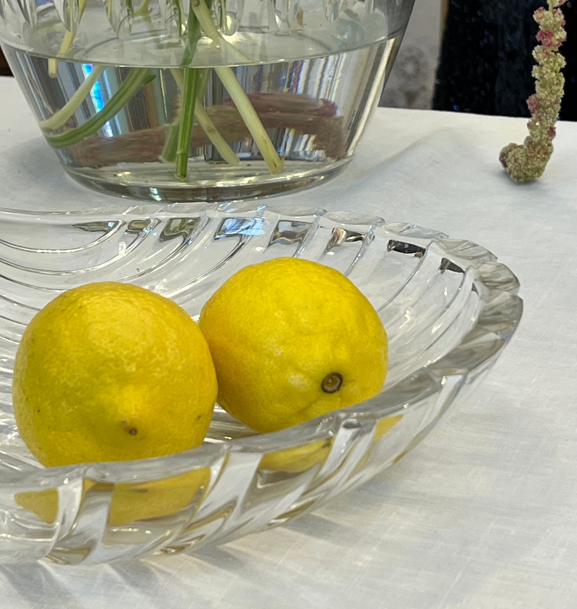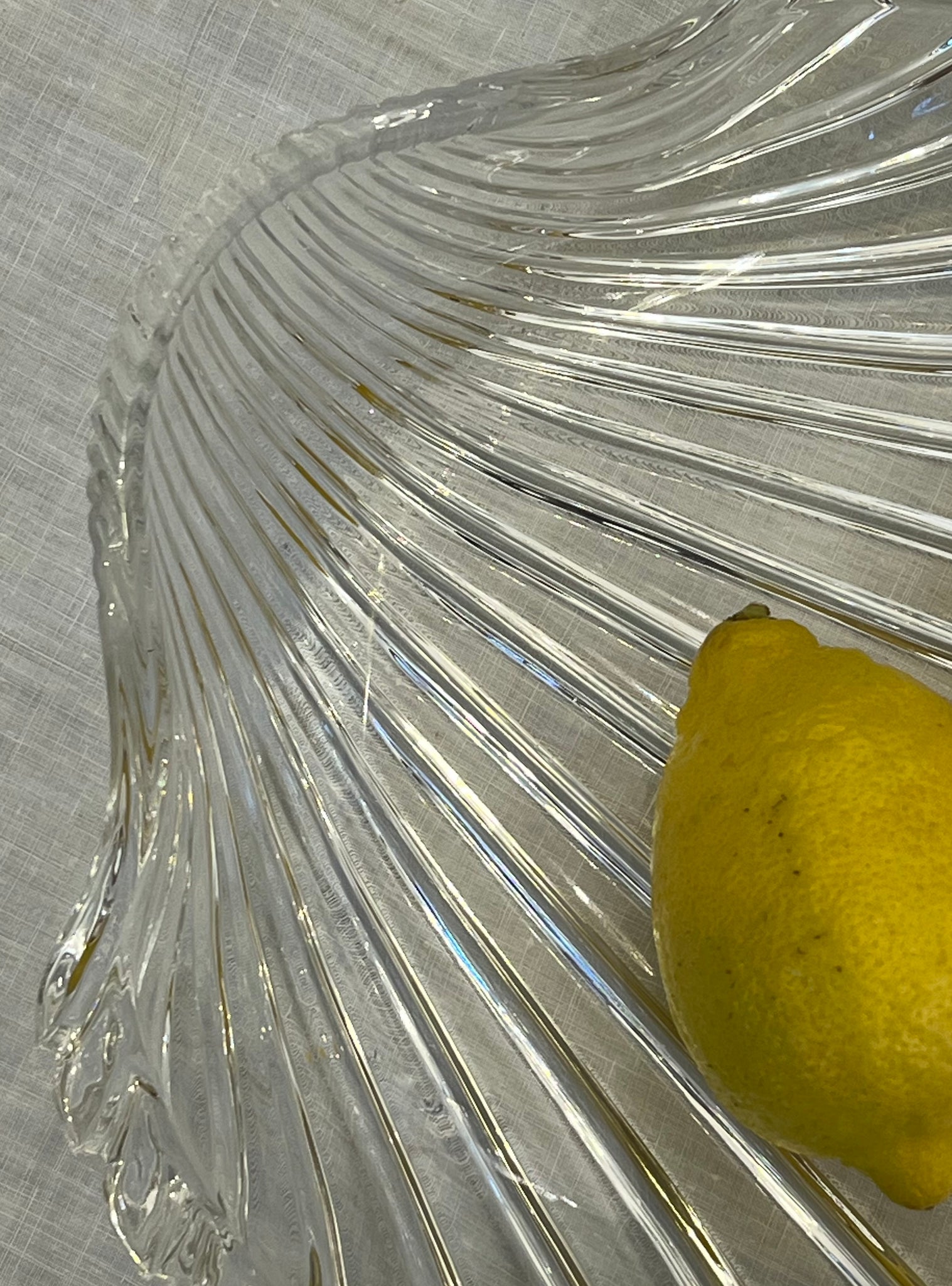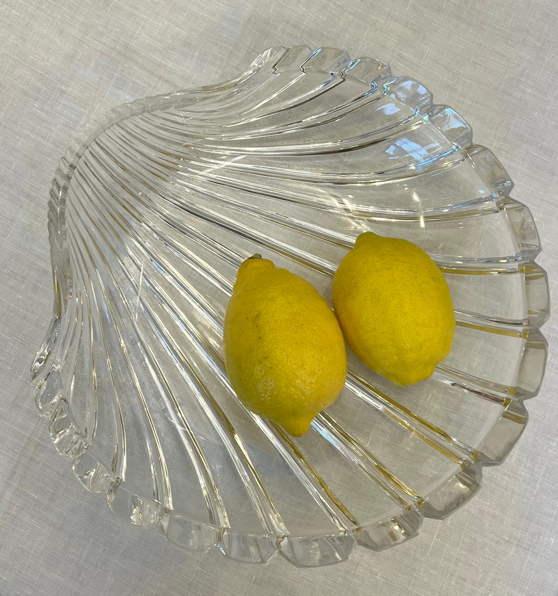 Platou vintage din cristal, proveniență Italia, jurul anilor 1970. Are formă de scoică, cu striații în relief. Este o piesă practică și decorativă, potrivită pentru servirea fructelor, prăjiturilor sau ca obiect de decor.
