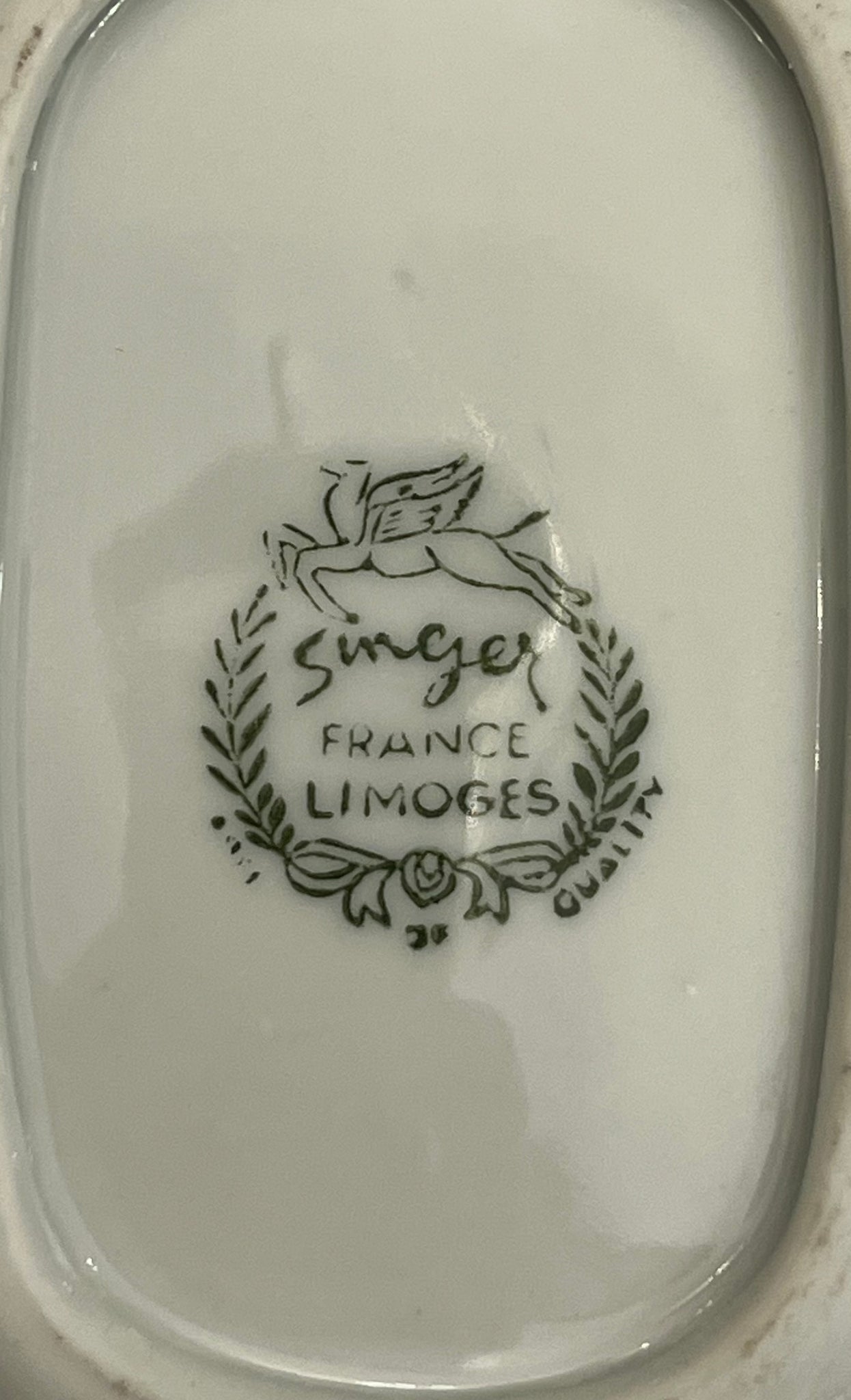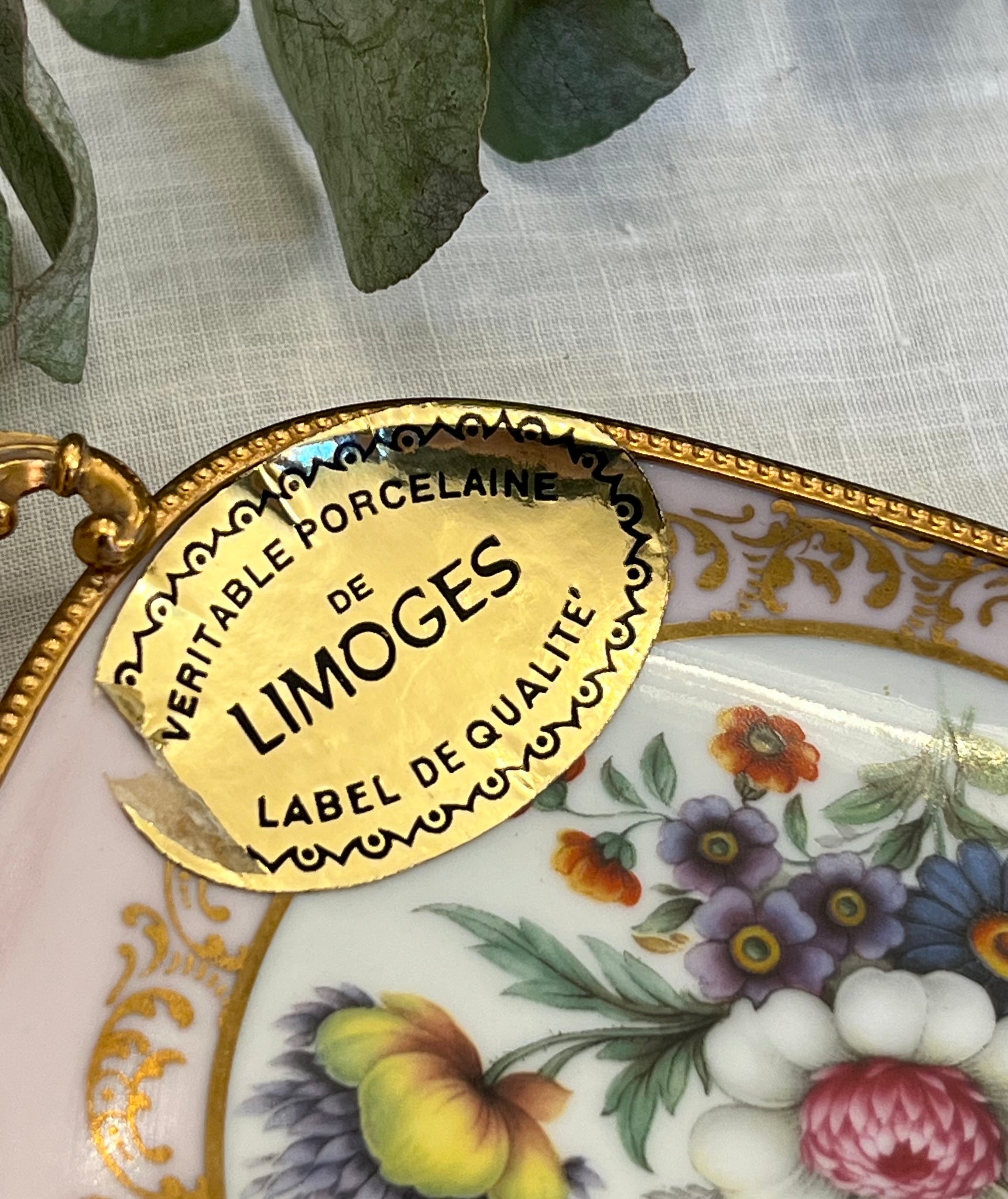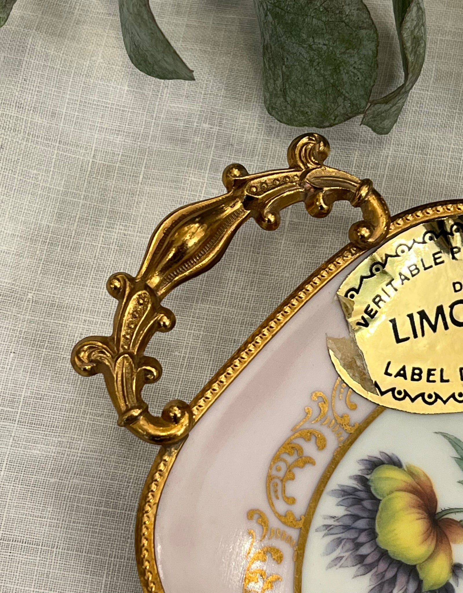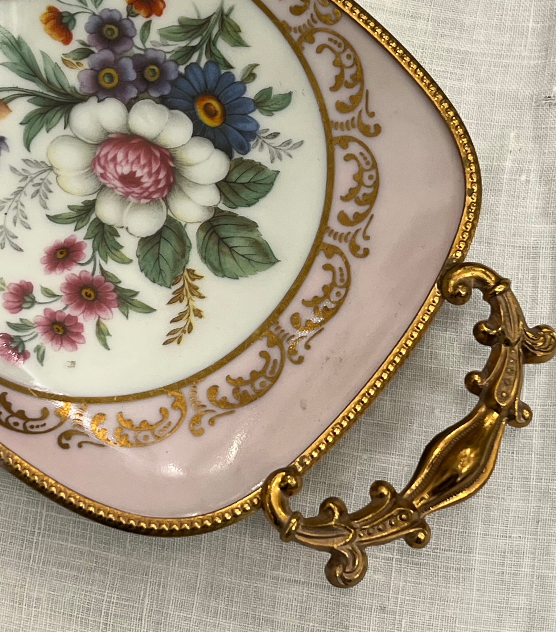 Platou miniatural vintage de colecție, realizat din porțelan Limoges, Franța, de către renumita fabrică Singer, aproximativ anii 1960. Este conturată cu o margine de culoare roz pastel și pictată manual cu aur de 24K. Piesa este completată de două mânere laterale dîn bronz, în stil rococo. Ideală ca farfurioară pentru bijuterii, pentru păstrarea cheilor sau a altor mărunțișuri prețioase.