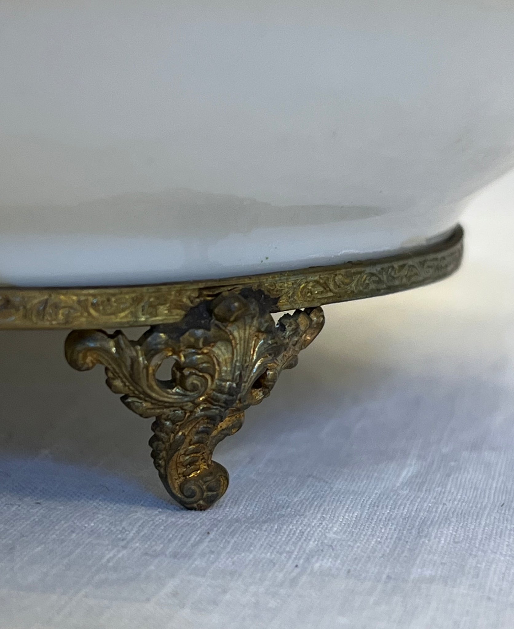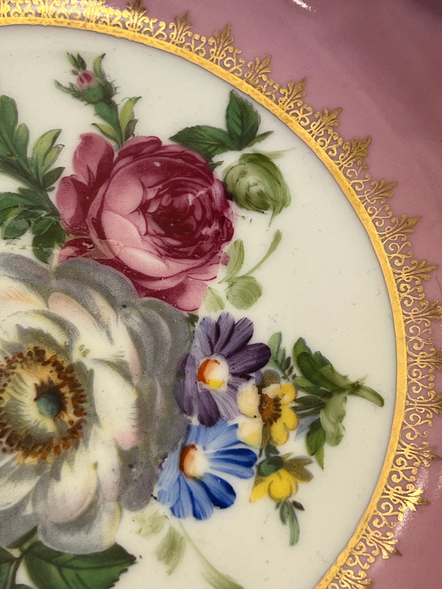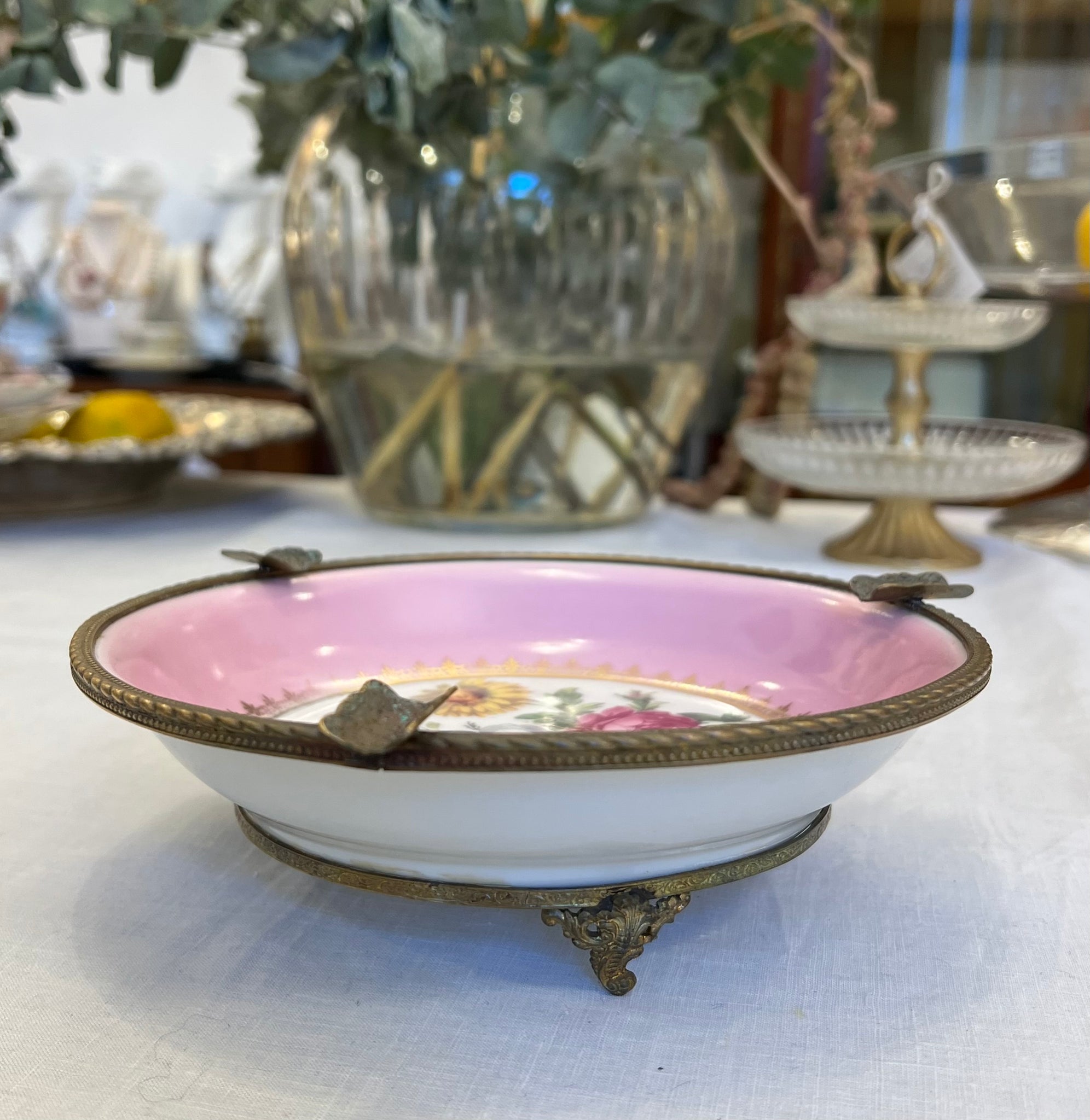 Scrumieră vintage realizată din porțelan fin de Limoges, decorată manual cu un buchet de flori, încadrat de un chenar roz și accente aurii. Piesa este completată de o montură din bronz, cu detalii ornamentale fine, specifice producțiilor franceze din perioada anilor 1950.