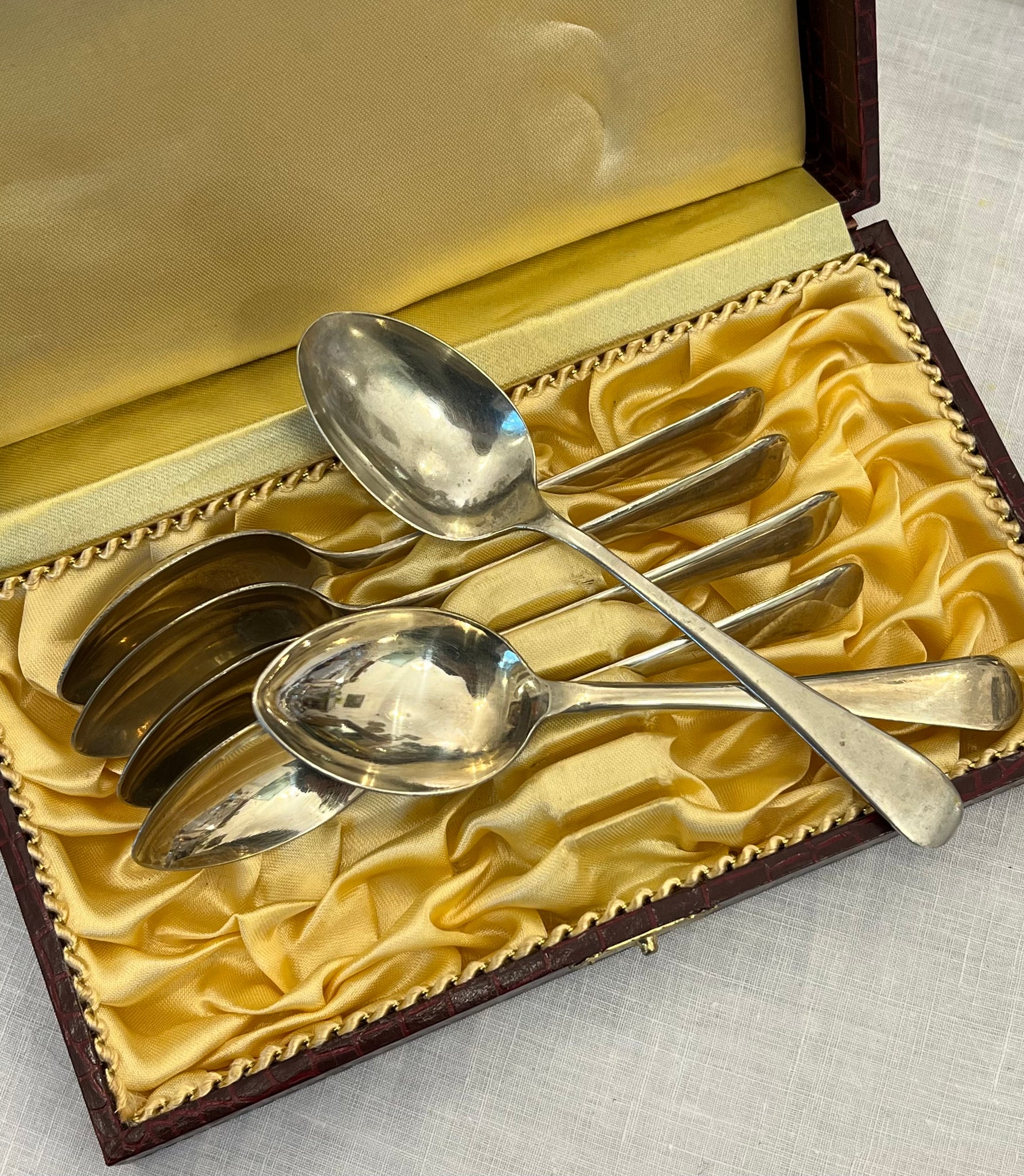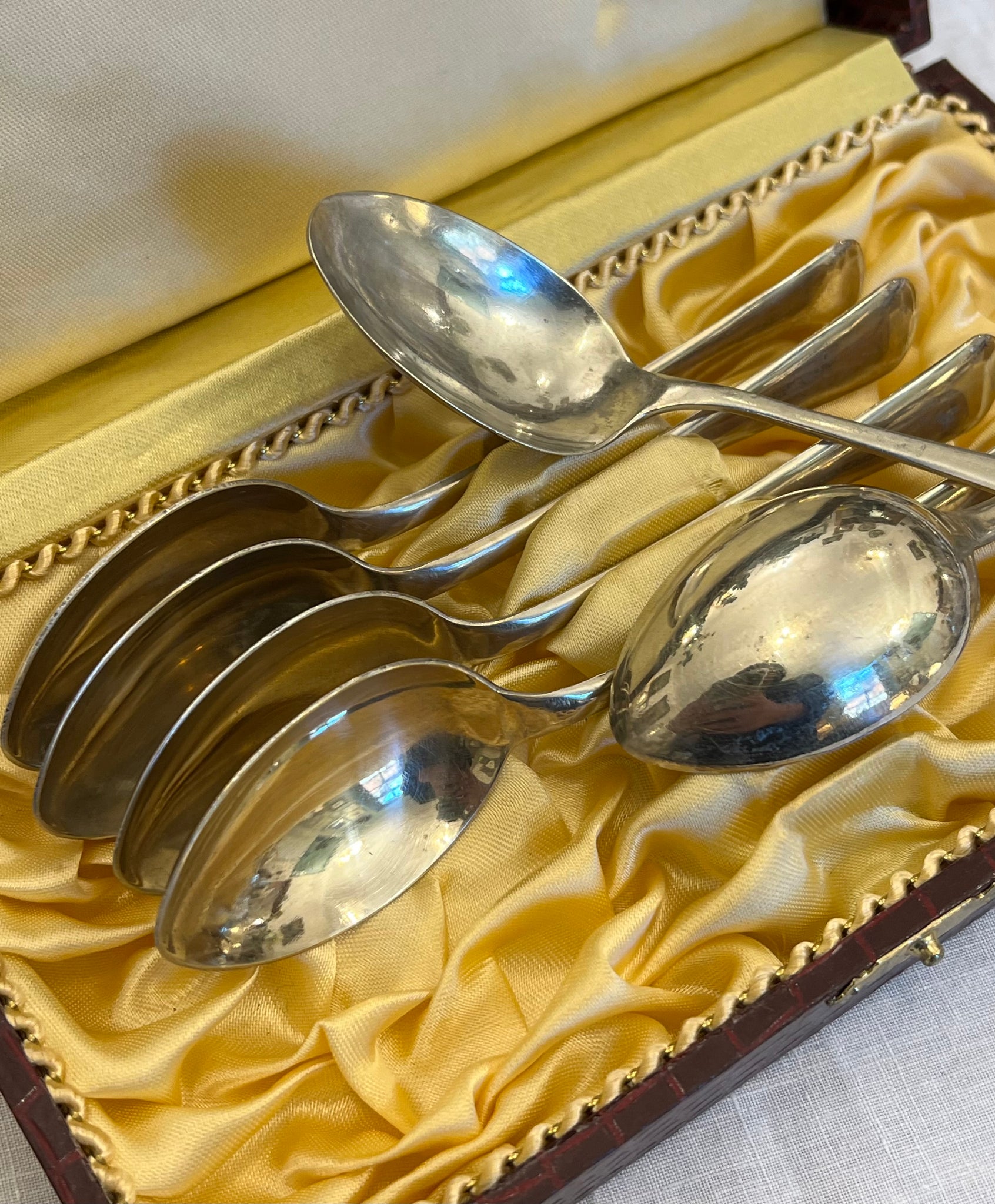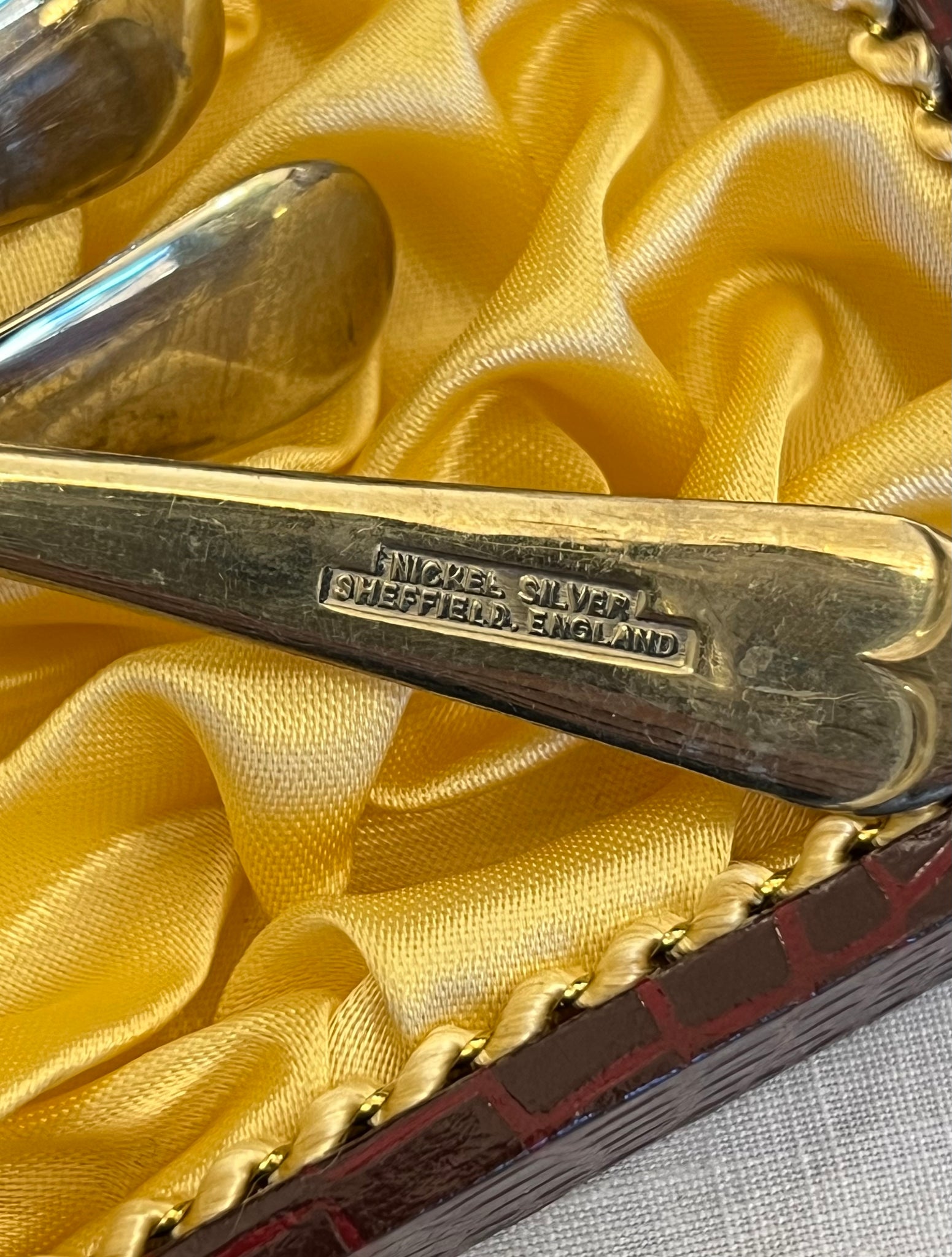 Set de lingurițe vintage, realizate în Sheffield, Anglia, oraș renumit pentru tradiția sa în prelucrarea metalelor și pentru calitatea excepțională a tacâmurilor britanice. Piesele sunt marcate Nickel Silver, indicație ce desemnează un aliaj de cupru, nichel și zinc, apreciat pentru luciul său similar argintului, dar cu o rezistență sporită la uzură. Lingurițele datează aproximativ din perioada anilor 1960 și se remarcă prin designul clasic, caracteristic tacâmurilor englezești. Setul este ideal atât pentru servirea cafelei sau a ceaiului, cât și ca obiect de colecție sau cadou.
