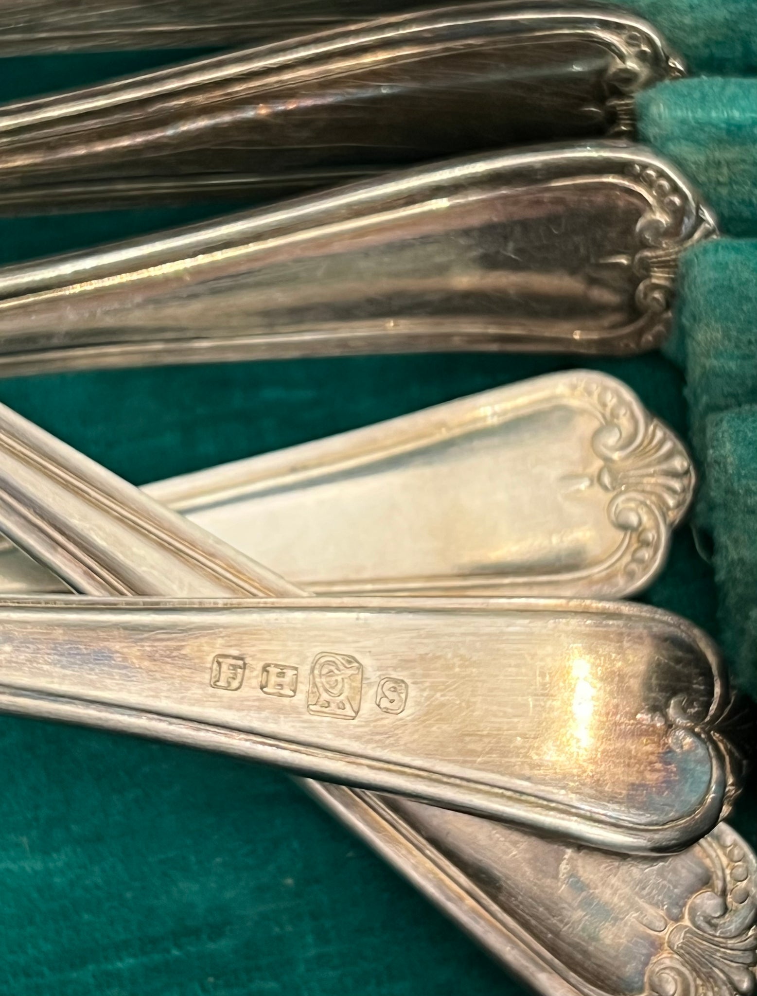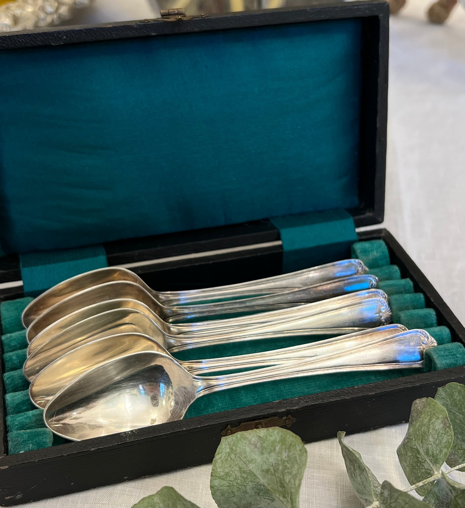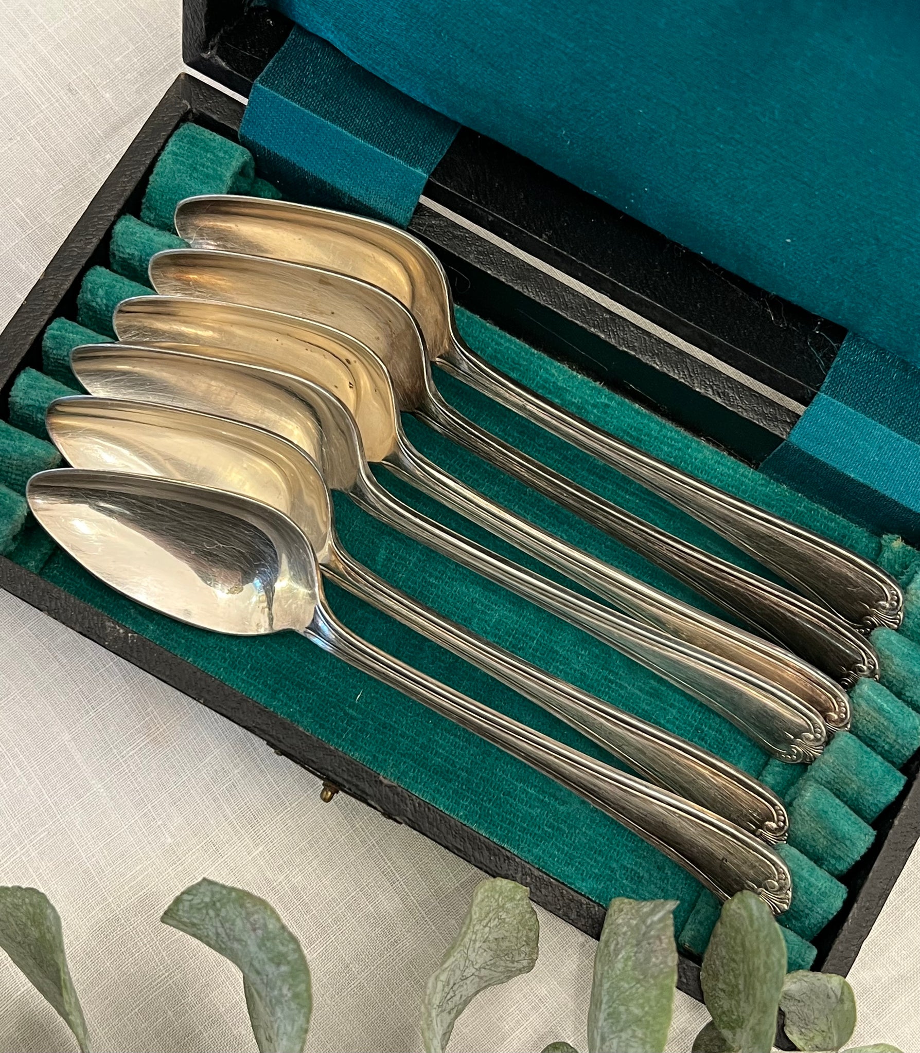 Set de lingurițe vintage din argint, realizate în aproximativ anii 1940, în faimosul centru de argintărie Sheffield, Anglia. Lingurițele sunt decorate cu un model clasic englez, cu accente rococo fine pe mâner.