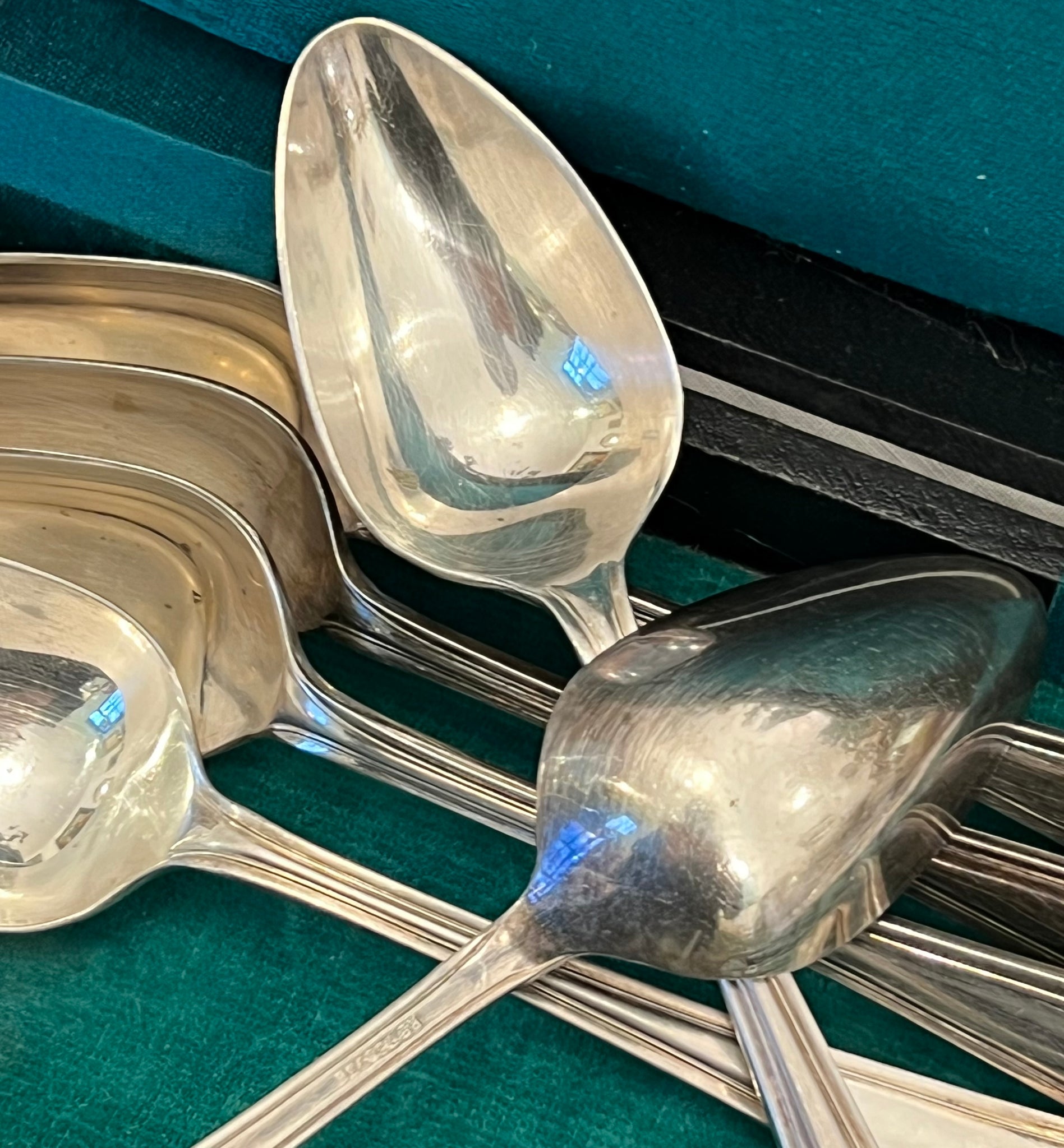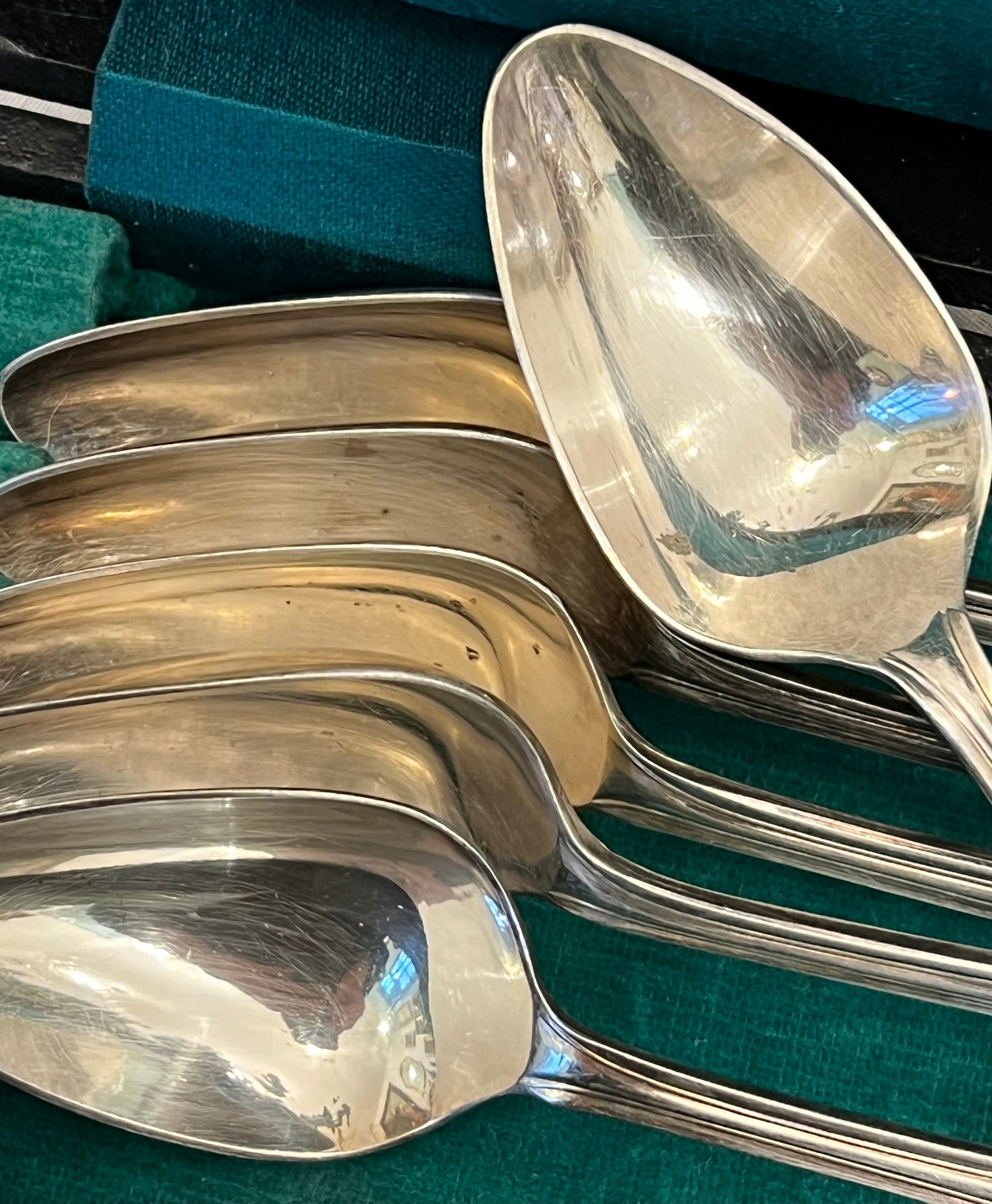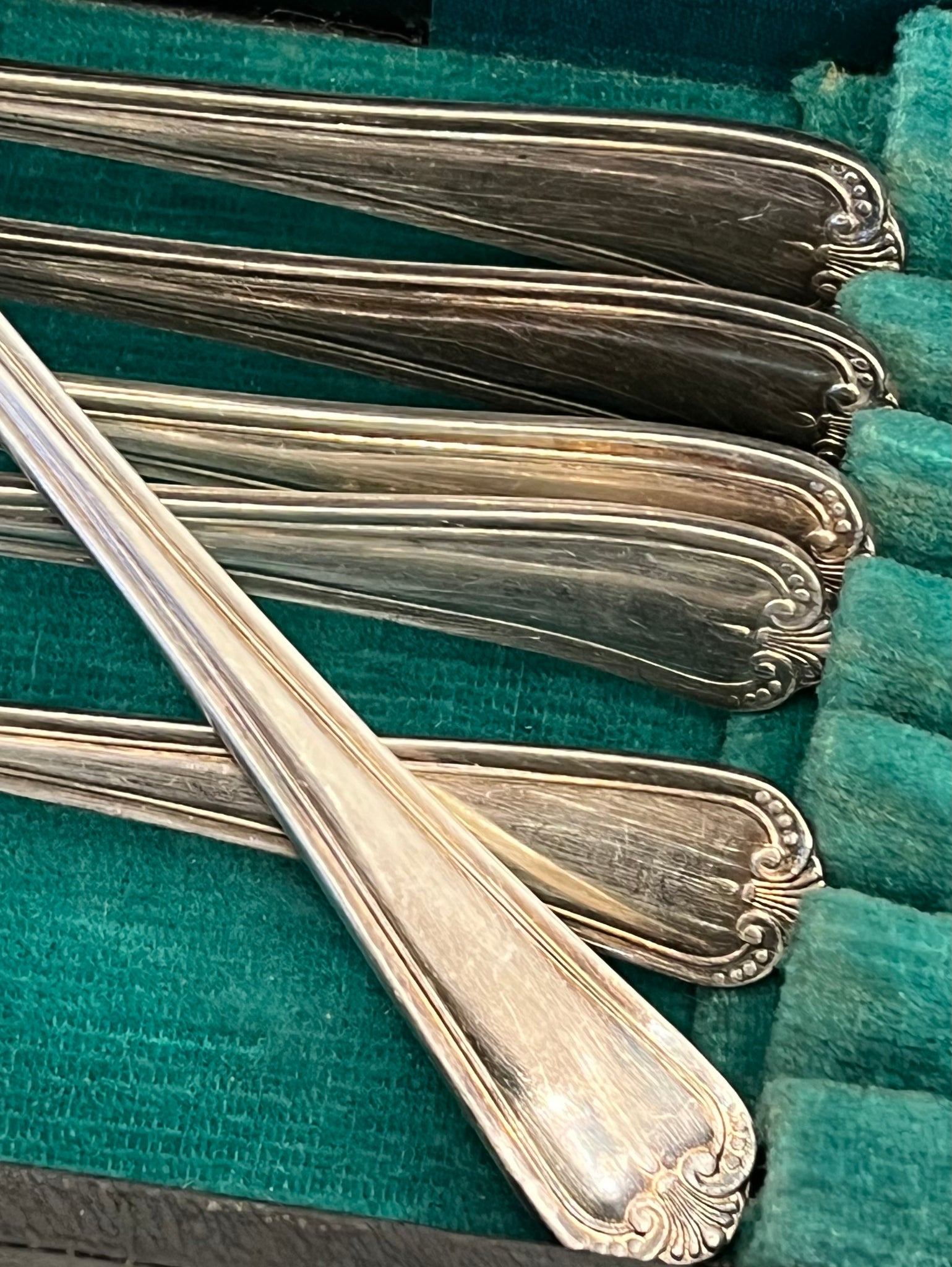 Set de lingurițe vintage din argint, realizate în aproximativ anii 1940, în faimosul centru de argintărie Sheffield, Anglia. Lingurițele sunt decorate cu un model clasic englez, cu accente rococo fine pe mâner.