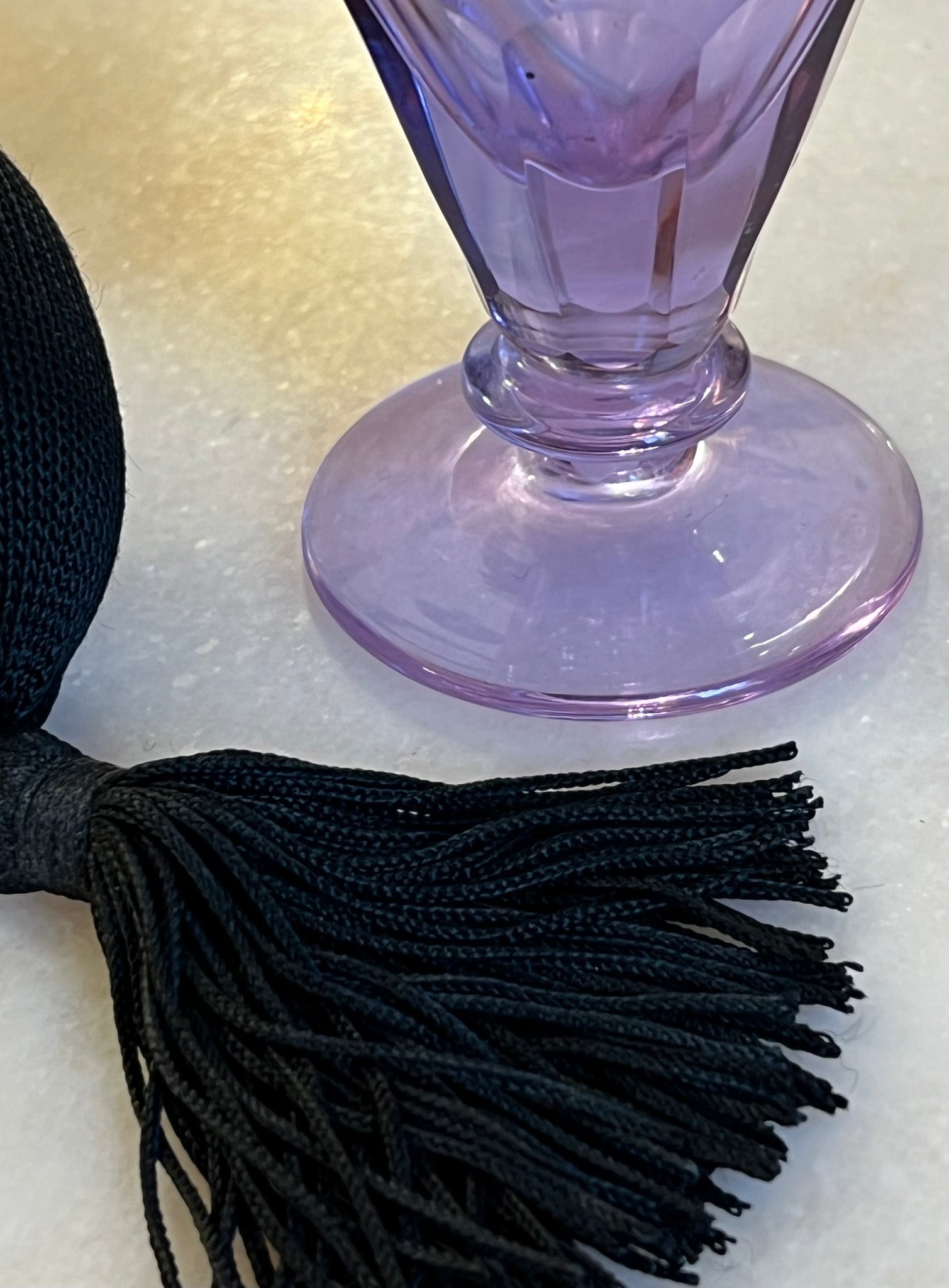 Sticlă de parfum vintage, realizată aproximativ în perioada anilor 1950, din sticlă mov și bronz gravat. Piesa este completă, cu mecanismul original din bronz și pompiță textilă neagră.
