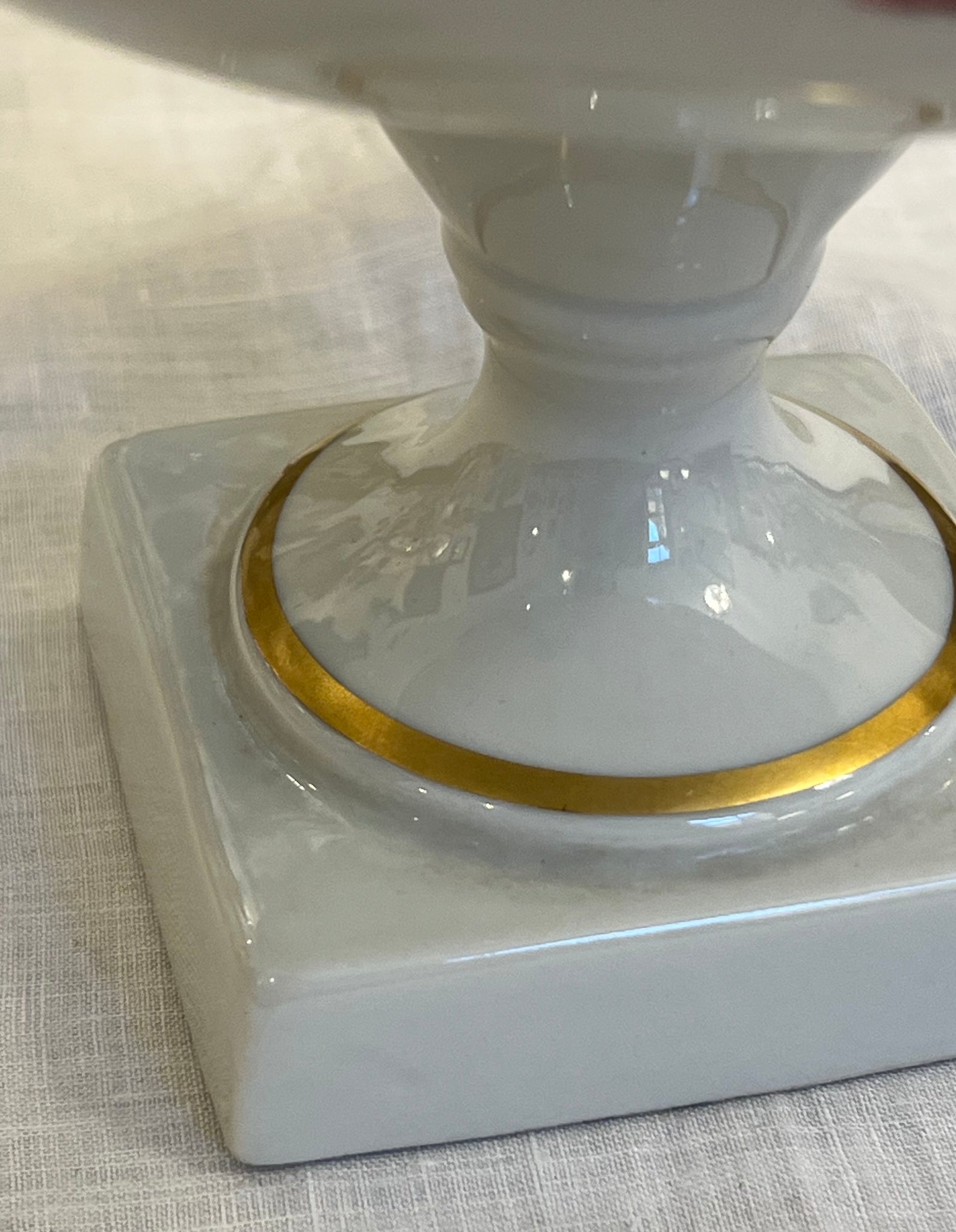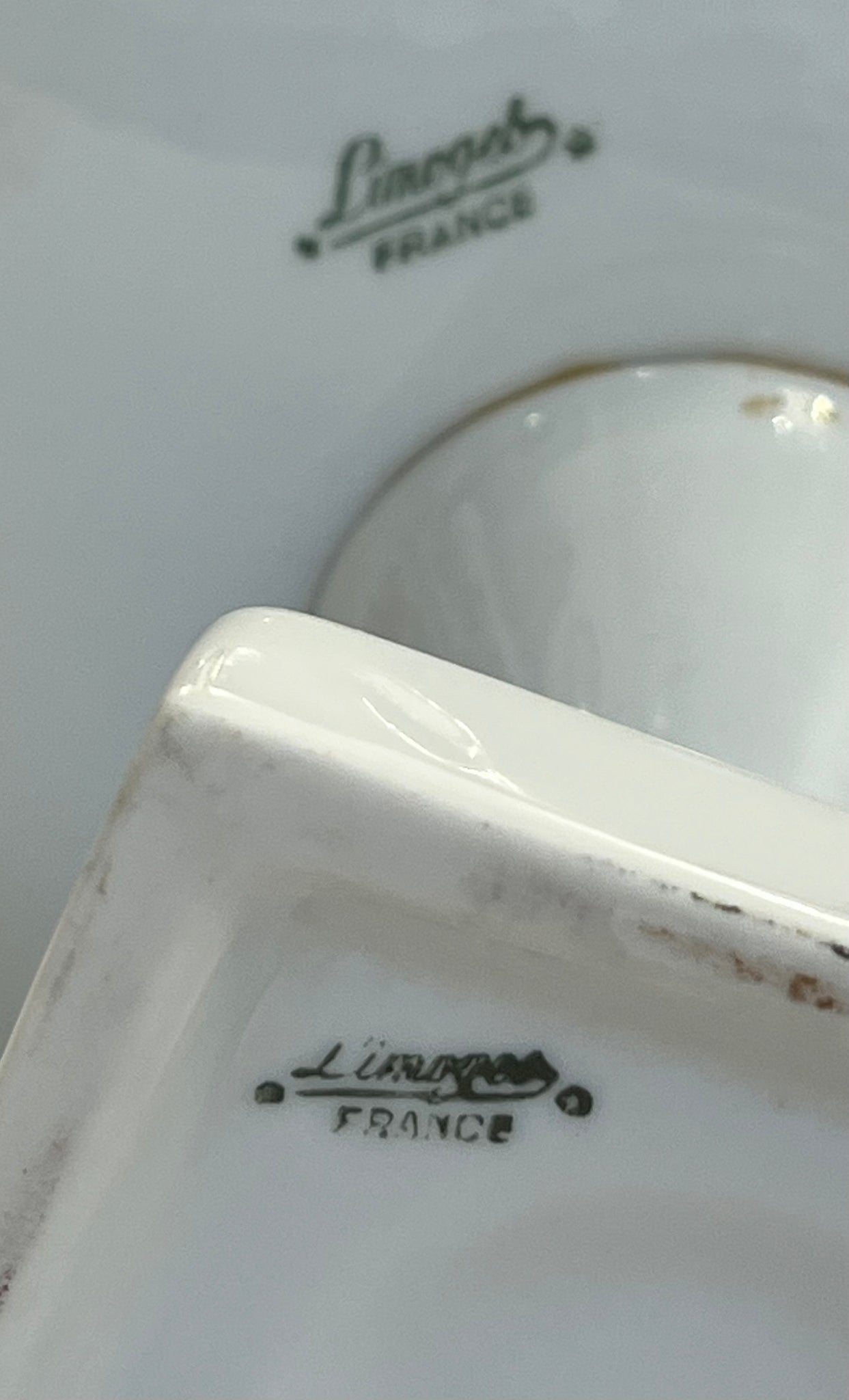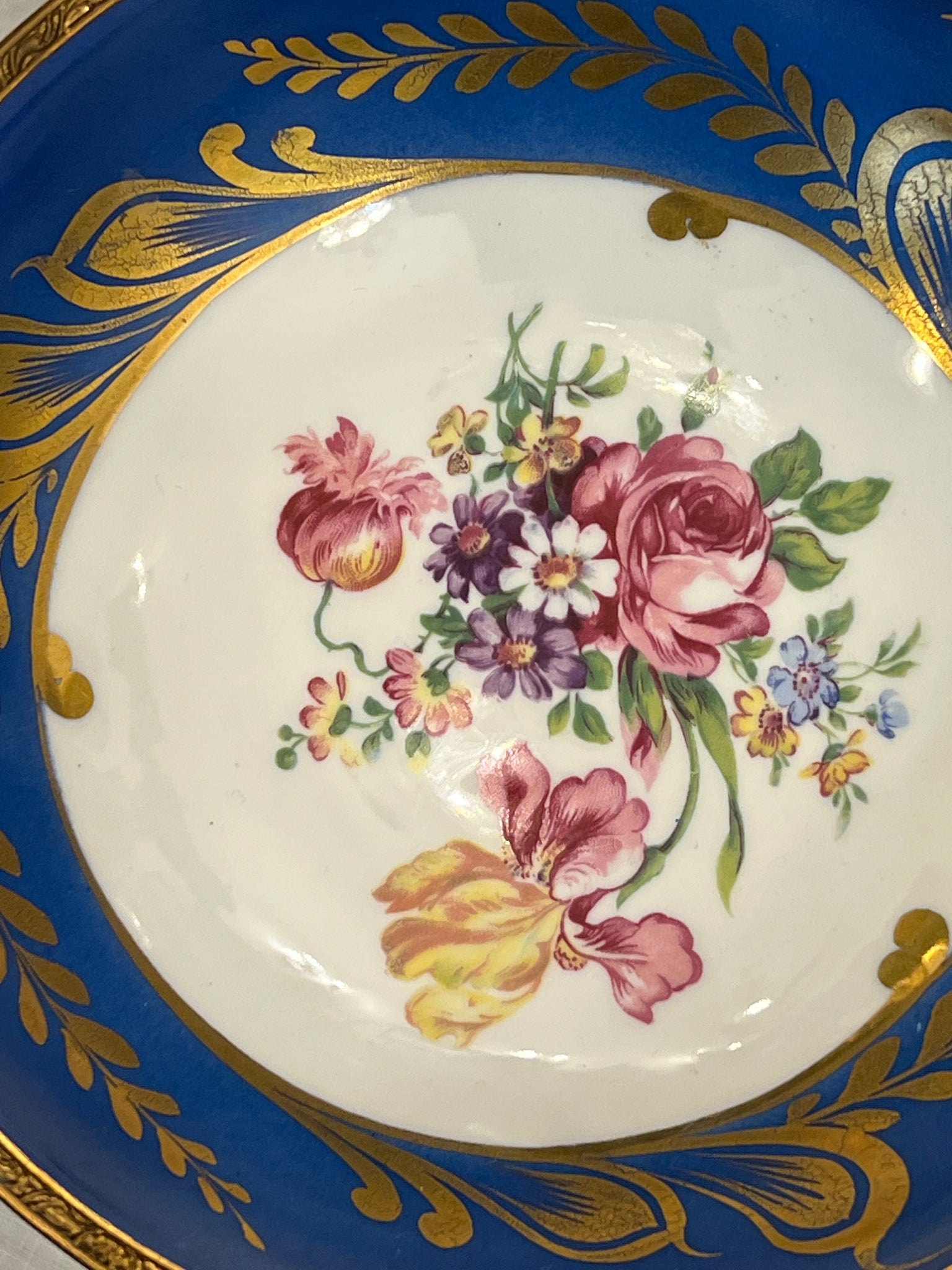 Recipient realizat din porțelan Limoges, Franța, cca. anii 1950, recunoscut pentru calitatea sa. Piesa este pictată manual, cu un decor floral pe exterior și un interior de un albastru intens, împodobit cu motive din aur 24K. Marginea și cele două mânere sunt din bronz, lucrat fin, în stil neoclasic. Poate fi folosit ca obiect decorativ, suport pentru bomboane sau fructe.