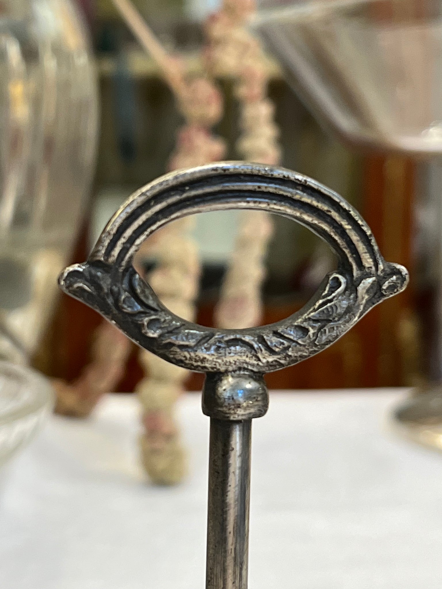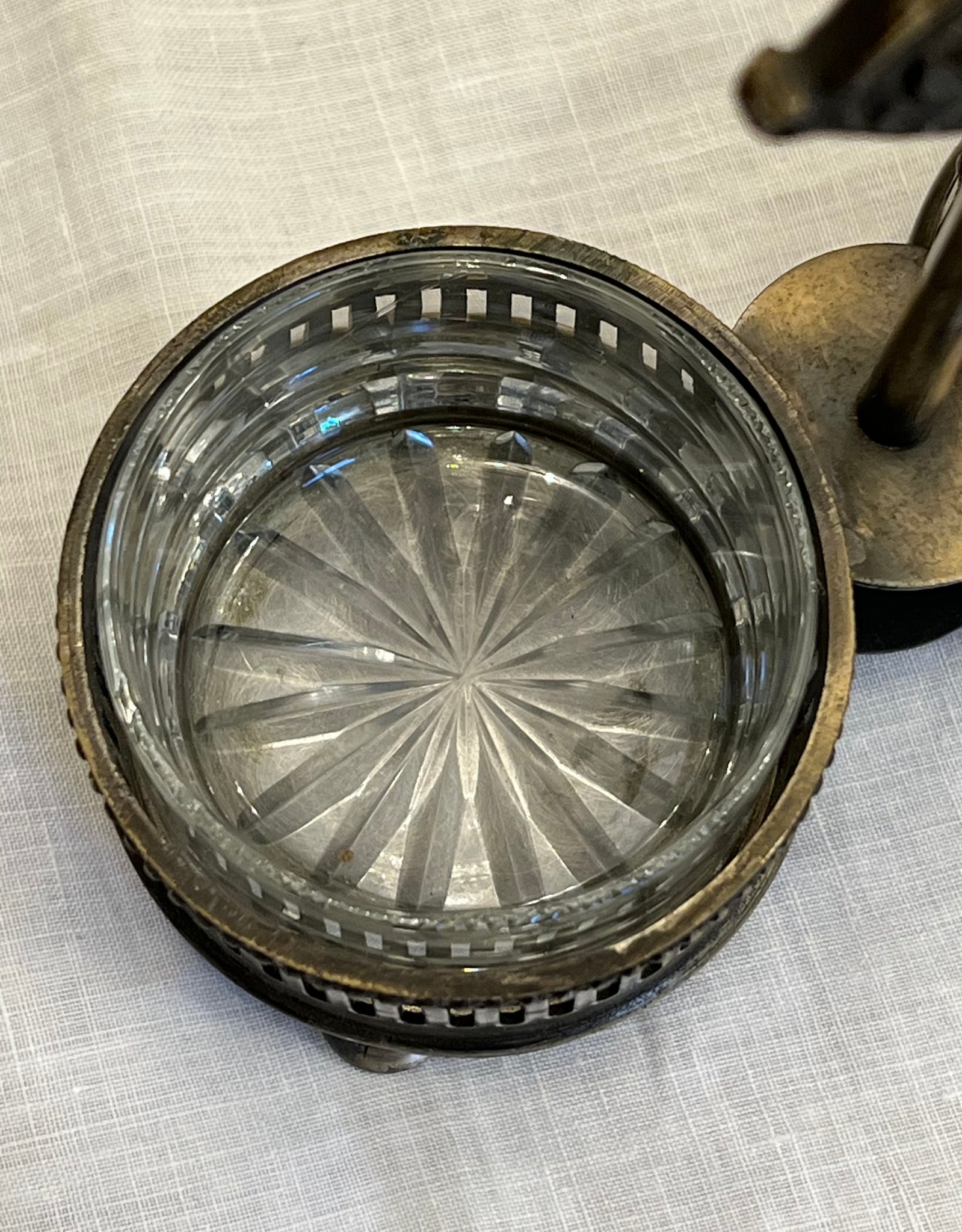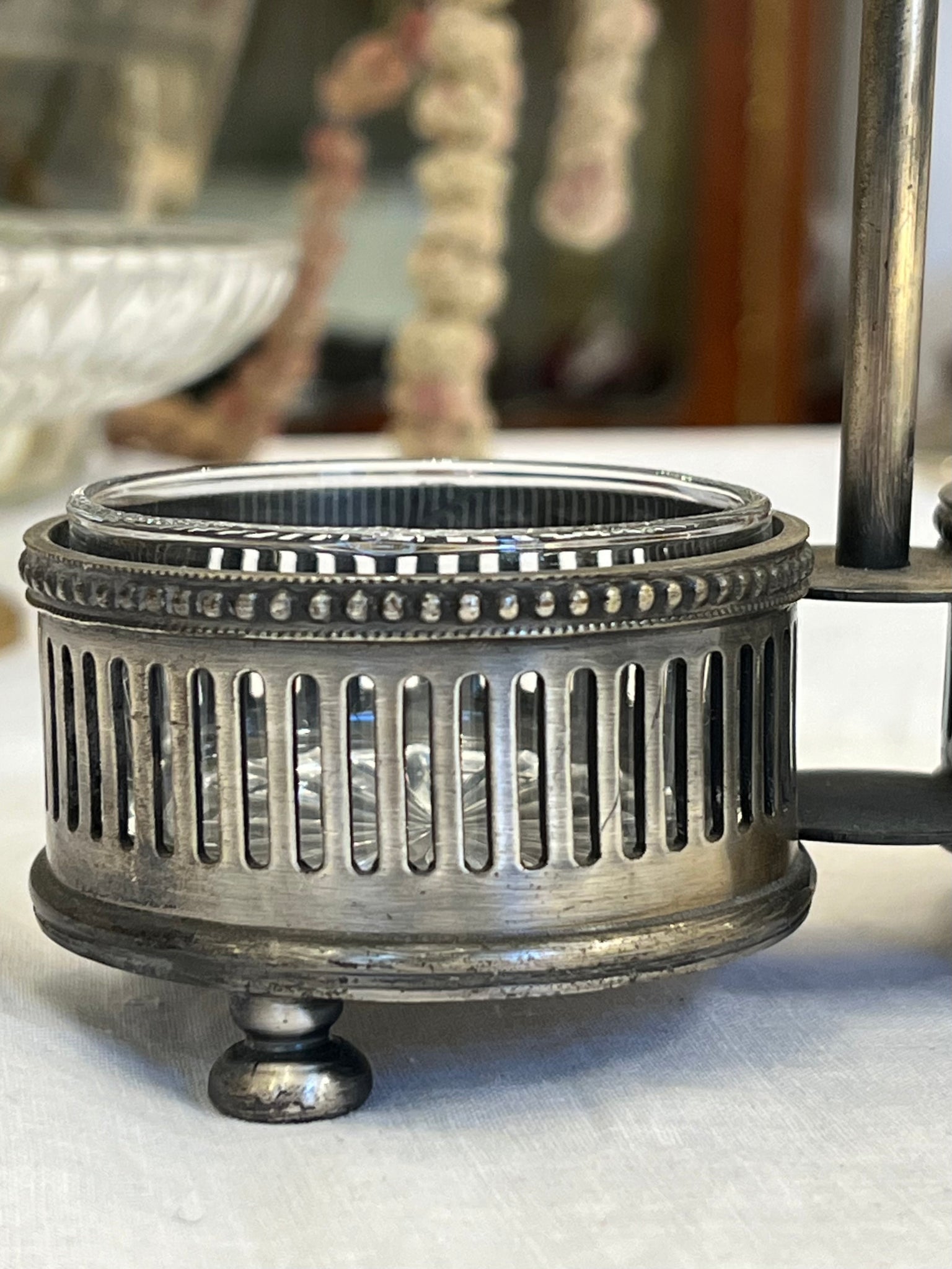 Set pentru condimente vintage, ce provine din perioada anilor 1960. Suportul este realizat din metal argintat, iar în fiecare cuvă este încadrat un recipient din sticlă.