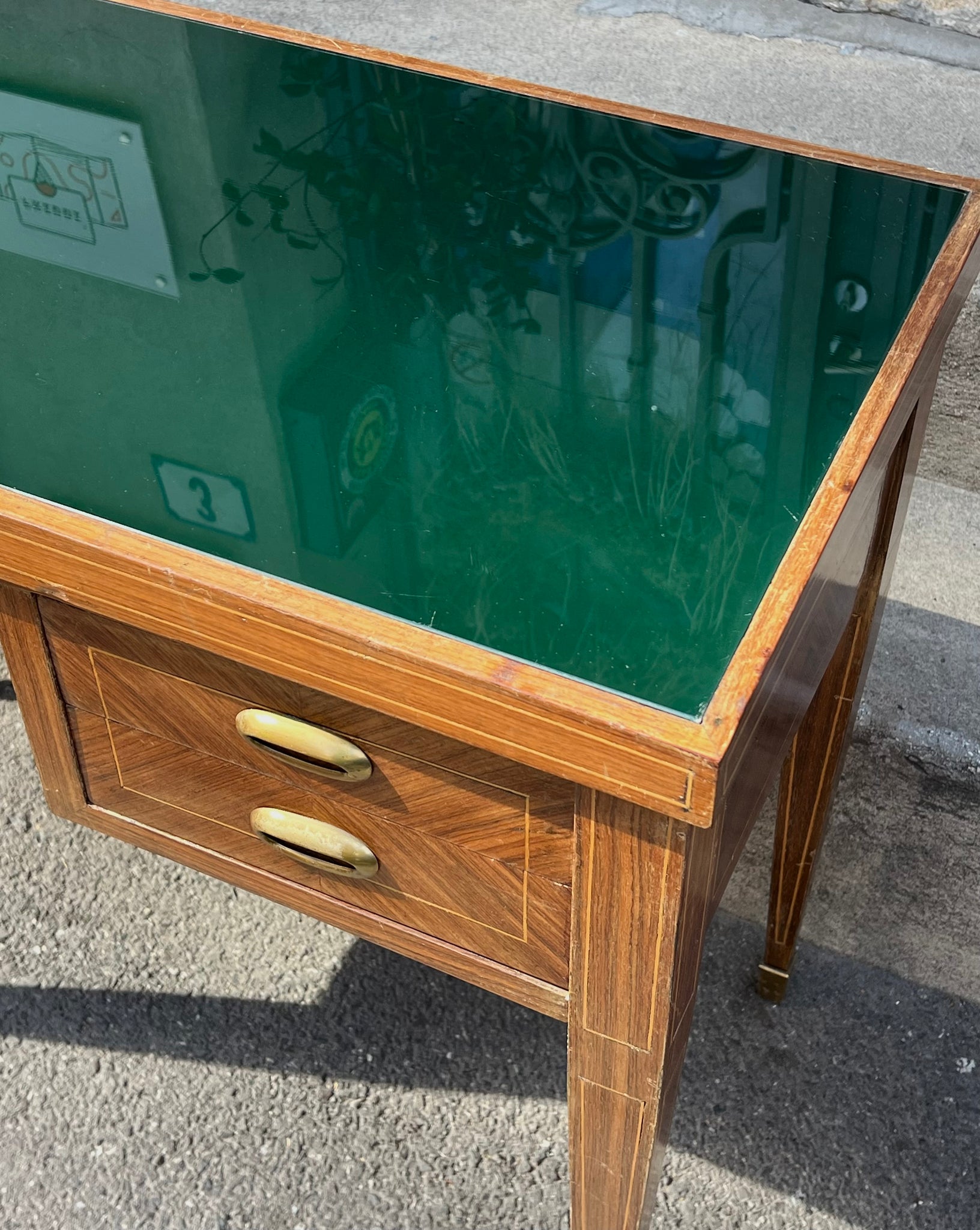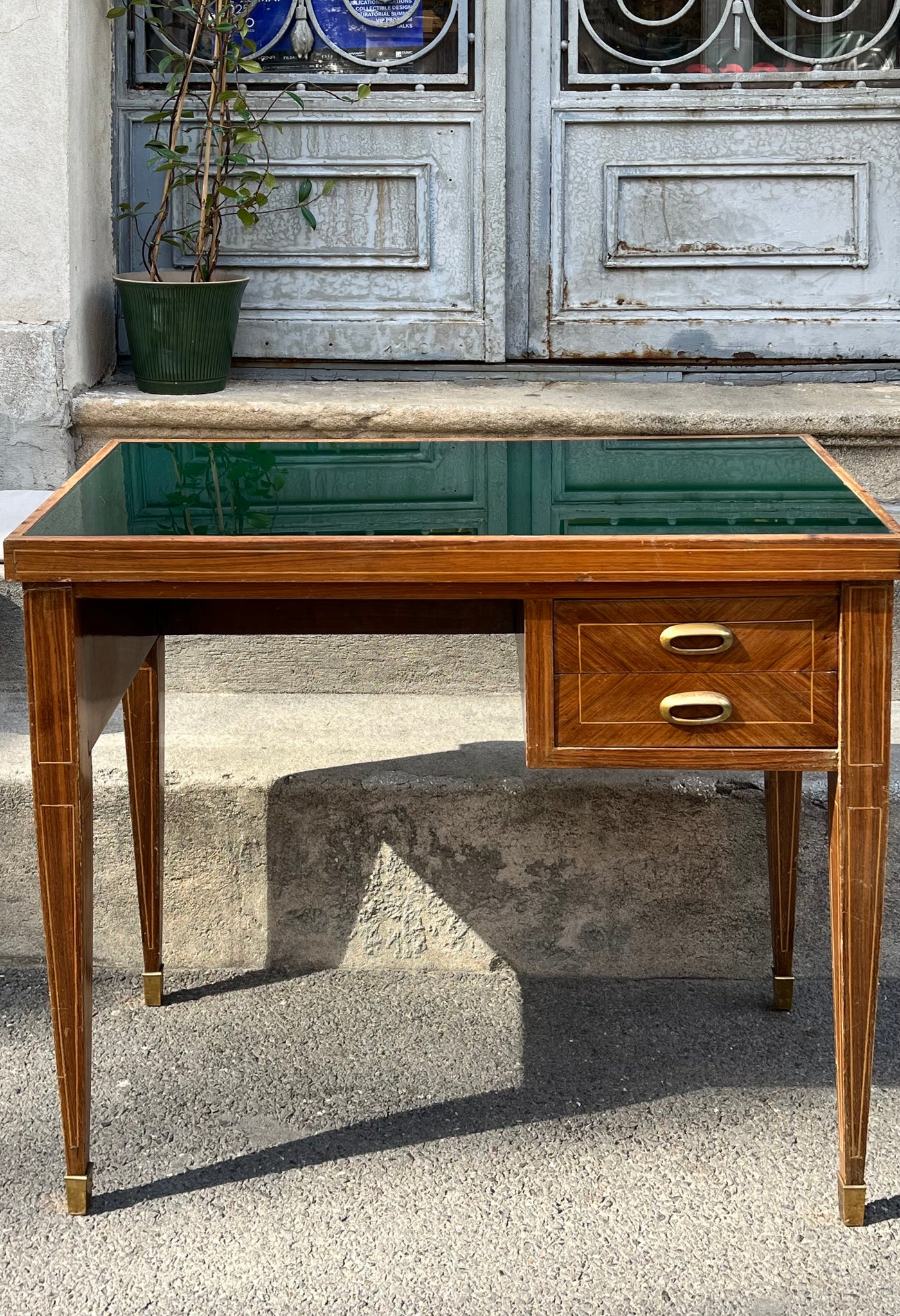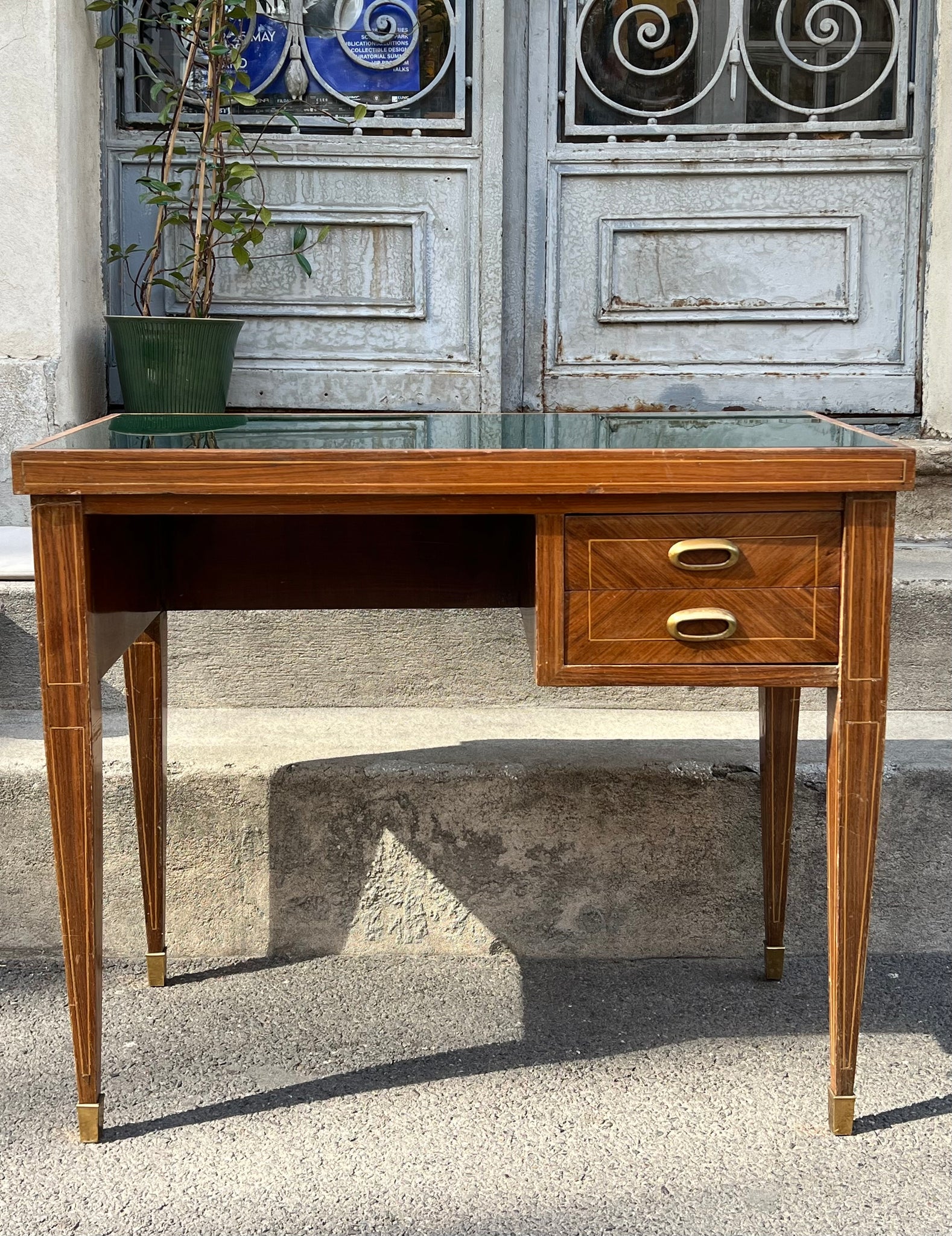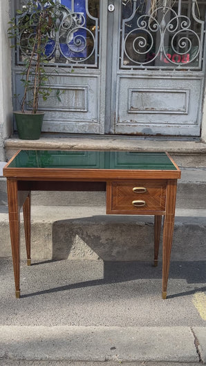 Birou vintage, realizat în jurul anilor 1950, este construit din lemn de cireș, cu inserții de bronz. Blatul este acoperit cu sticlă colorată verde. Această piesă se potrivește atât într-un spațiu de lucru, cât și ca accent într-un interior modern.