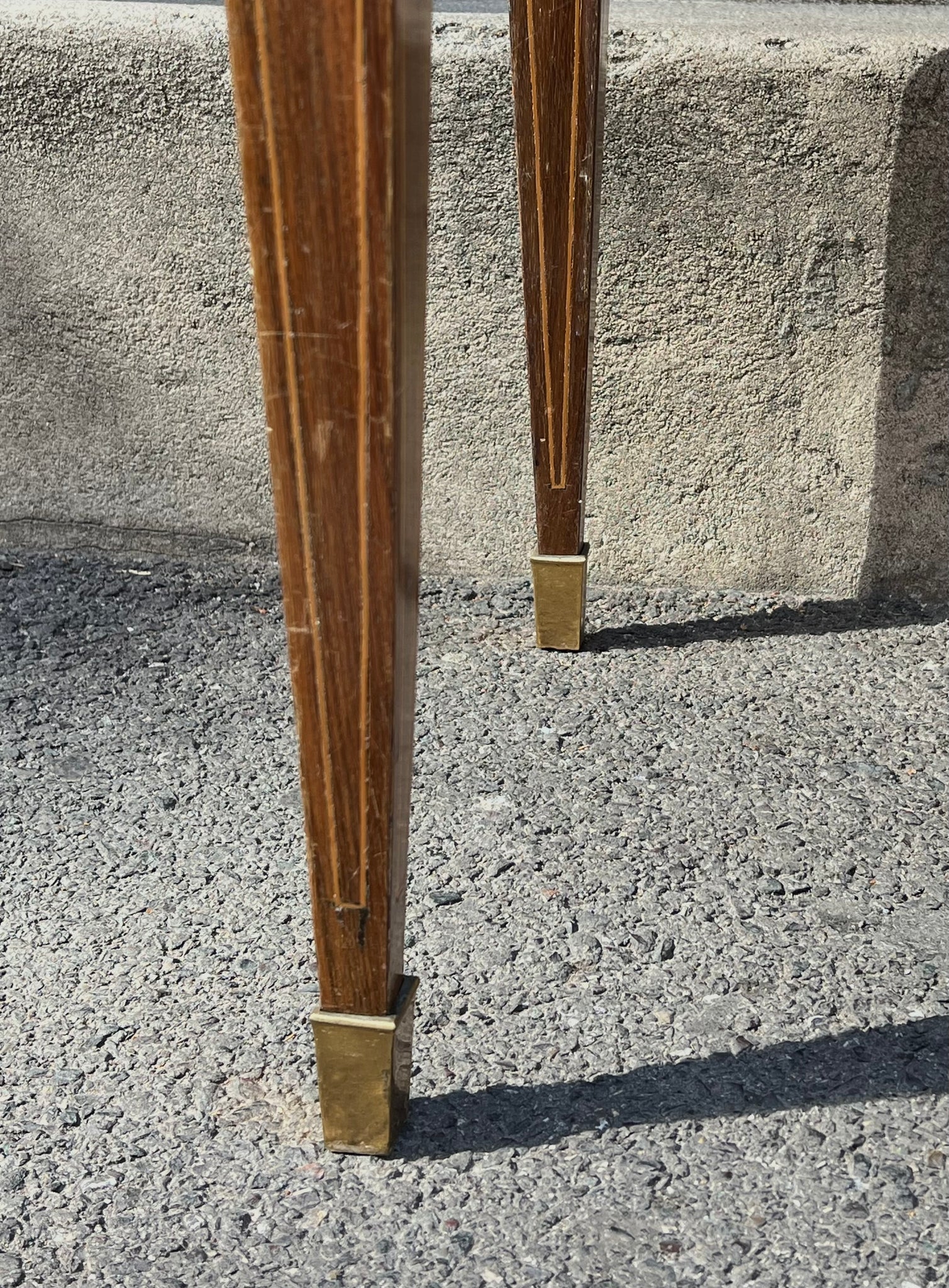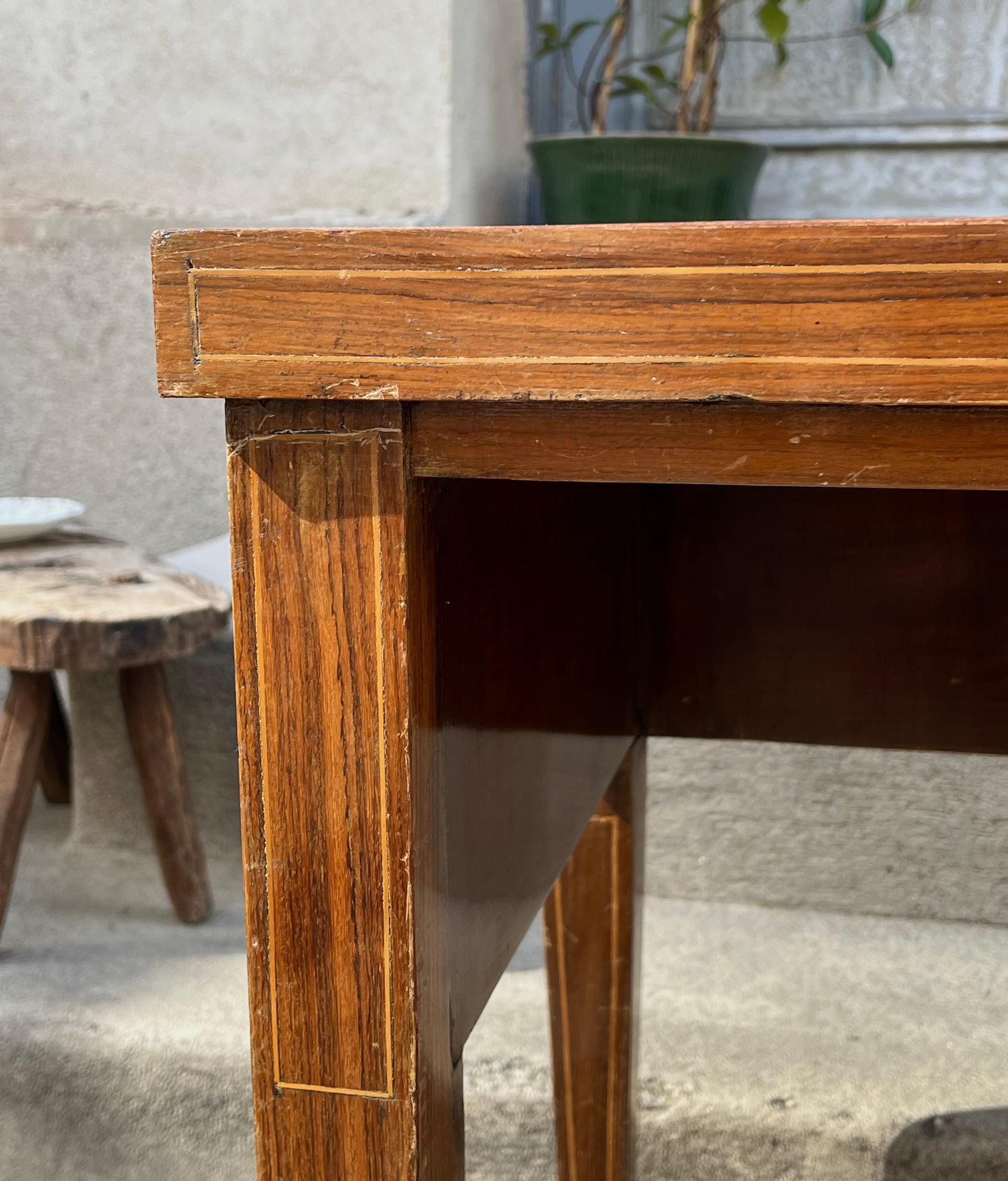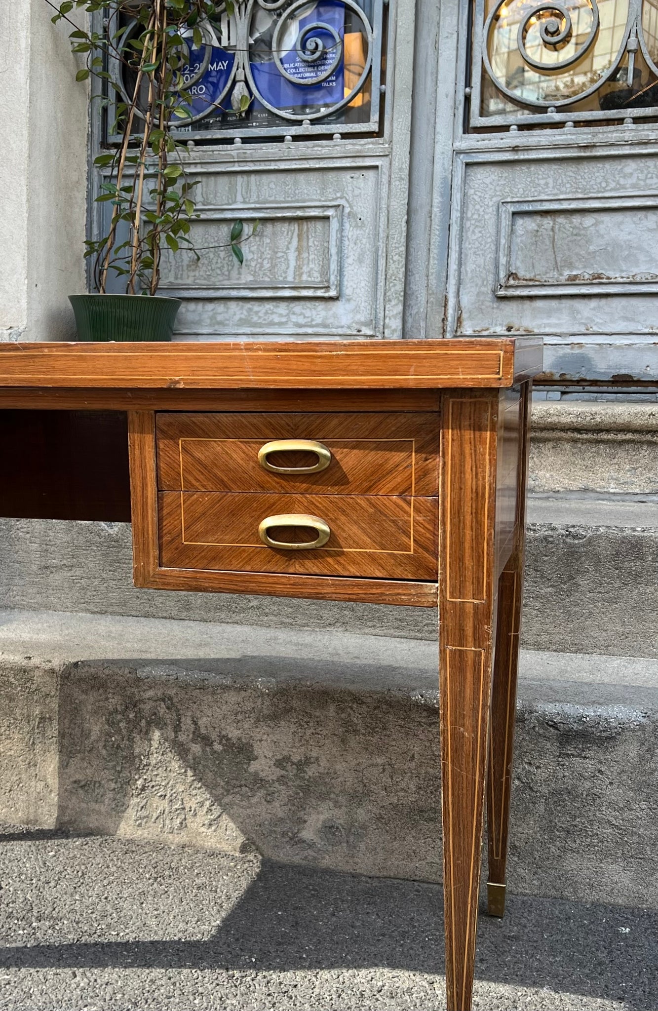 Birou vintage, realizat în jurul anilor 1950, este construit din lemn de cireș, cu inserții de bronz. Blatul este acoperit cu sticlă colorată verde. Această piesă se potrivește atât într-un spațiu de lucru, cât și ca accent într-un interior modern.