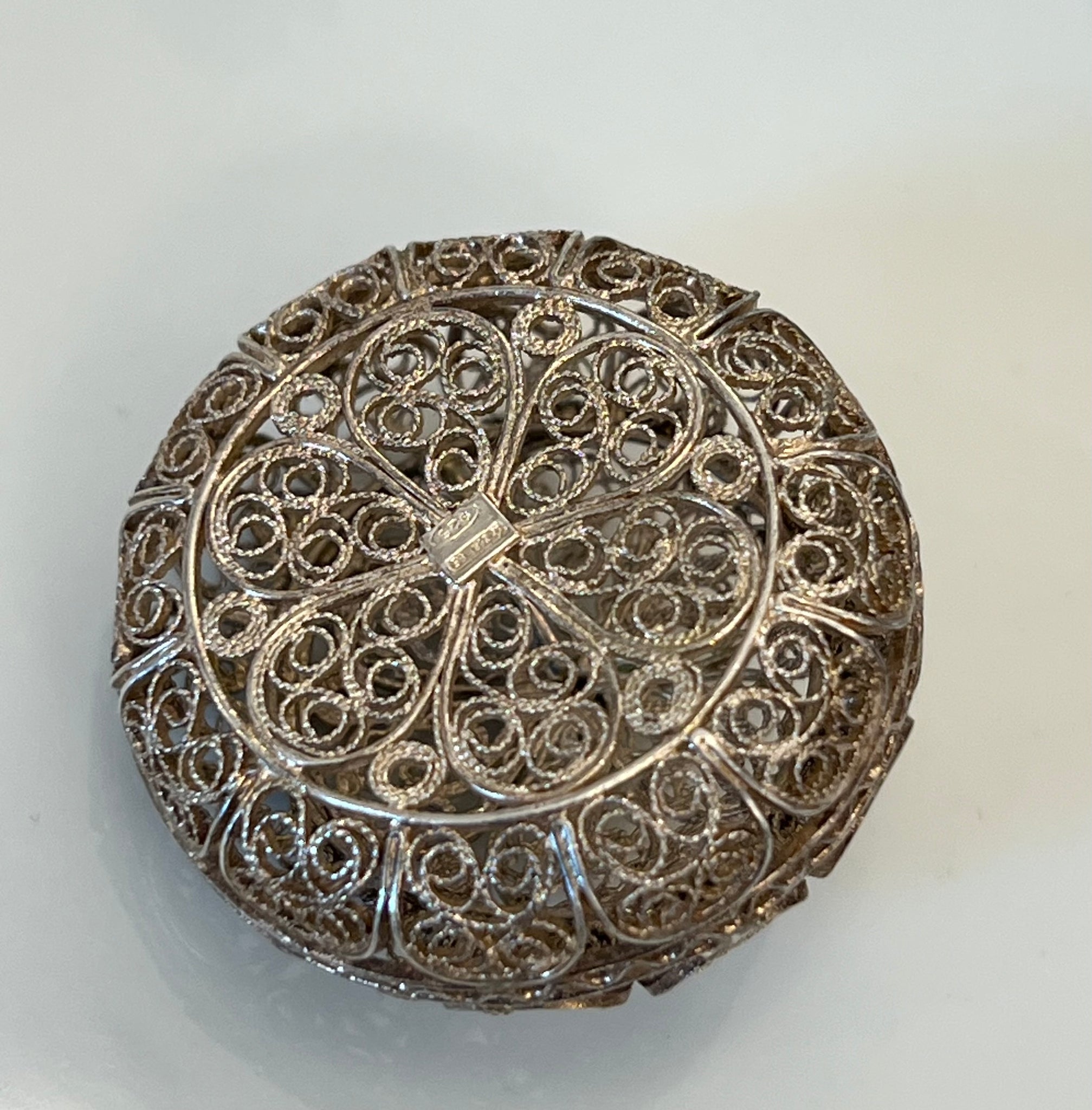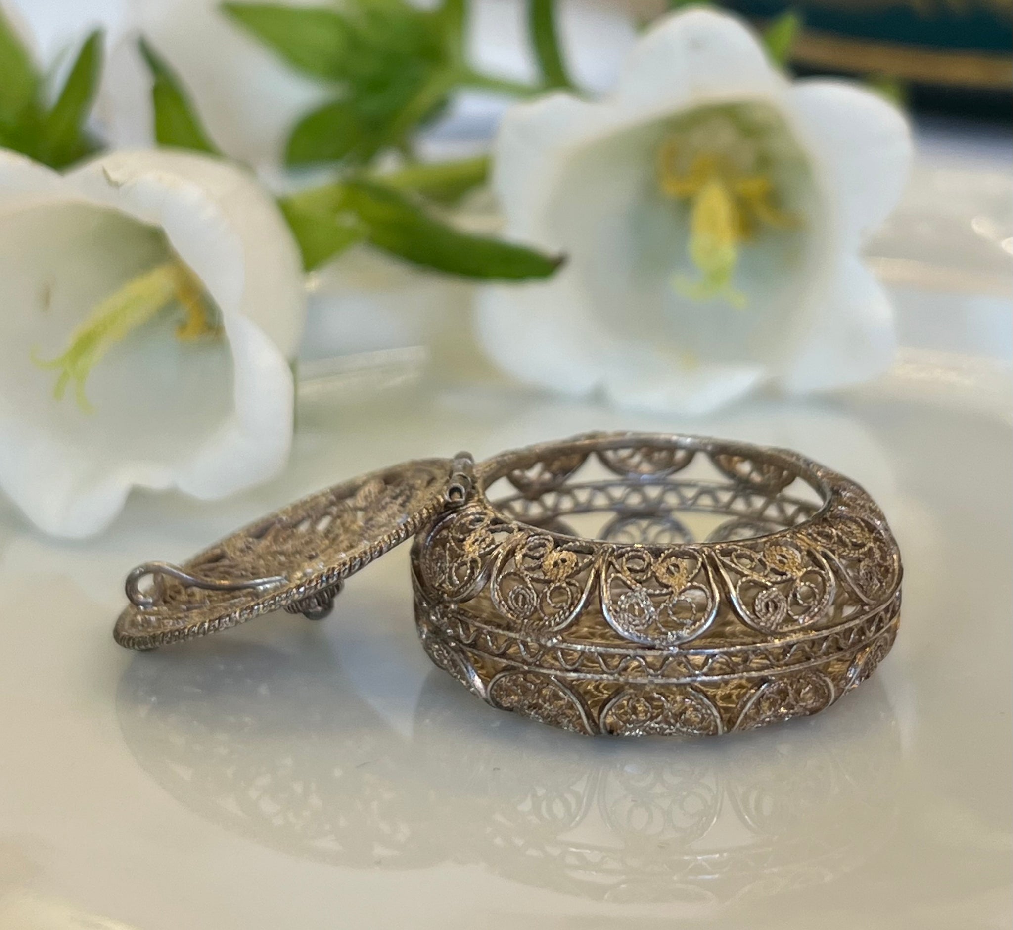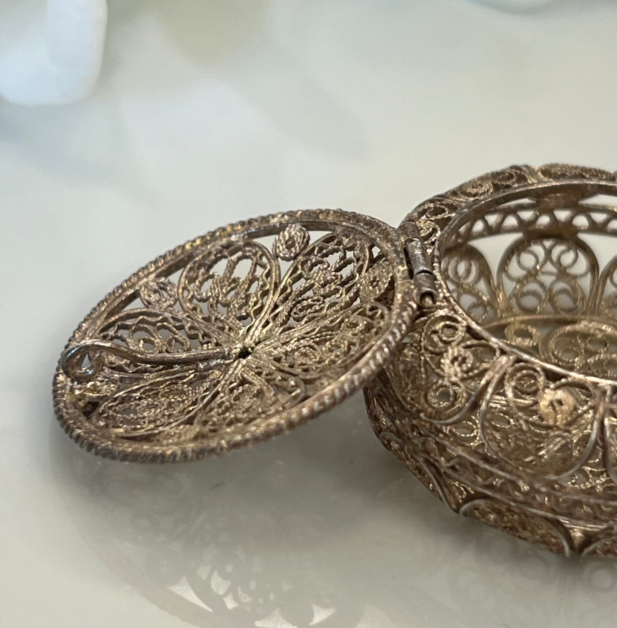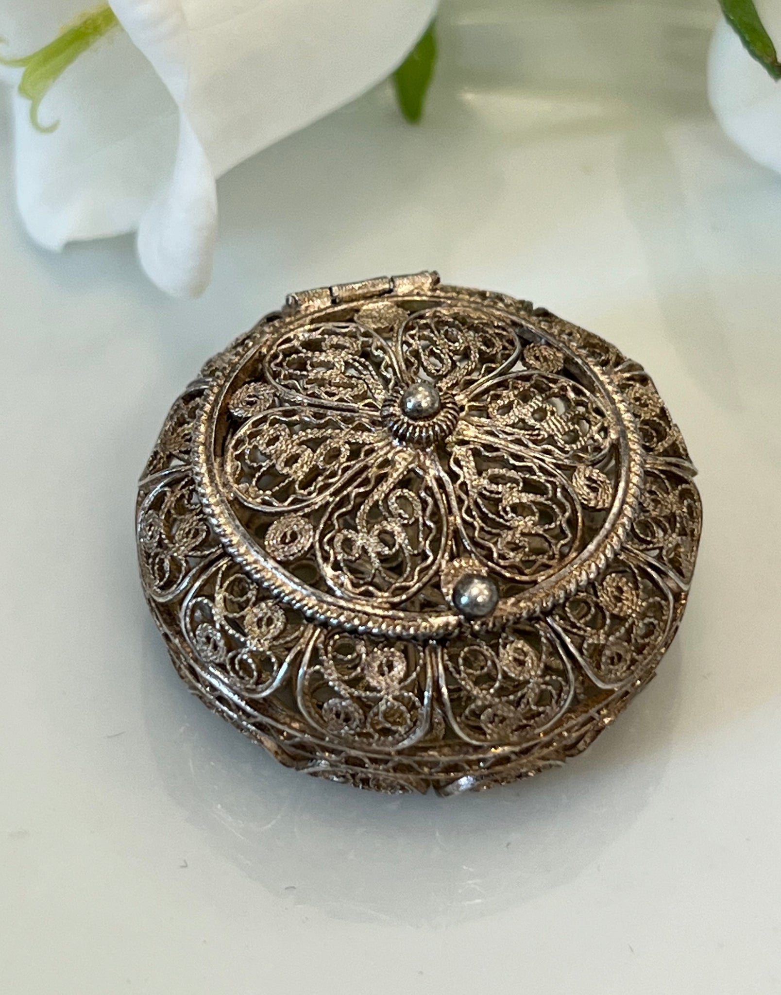 Cutie miniaturală vintage, realizată cu măiestrie din argint 925. Cutia este creată prin tehnica complexă a filigranului, în care fire subțiri de argint sunt împletite și răsucite manual pentru a crea un design dantelat.